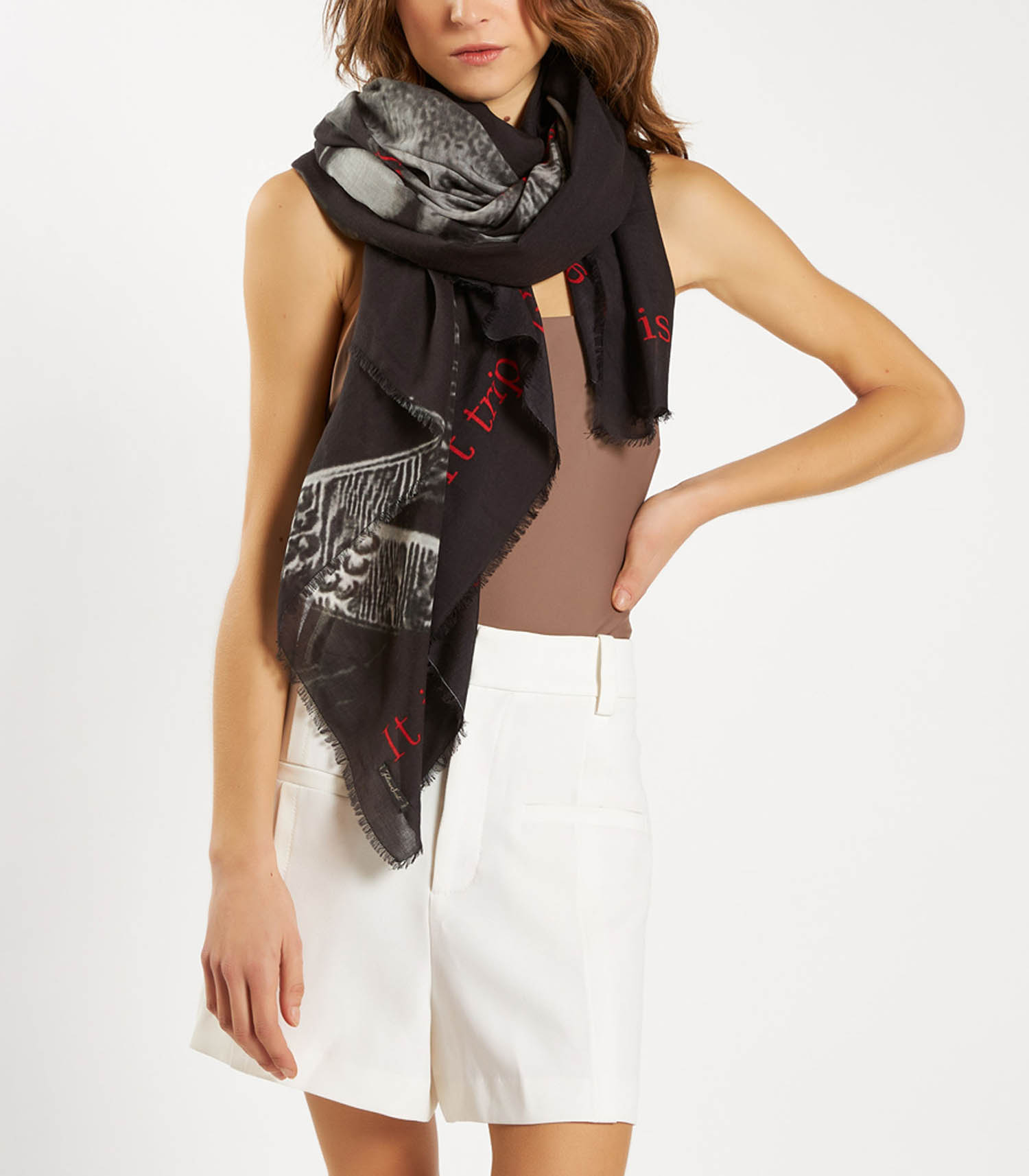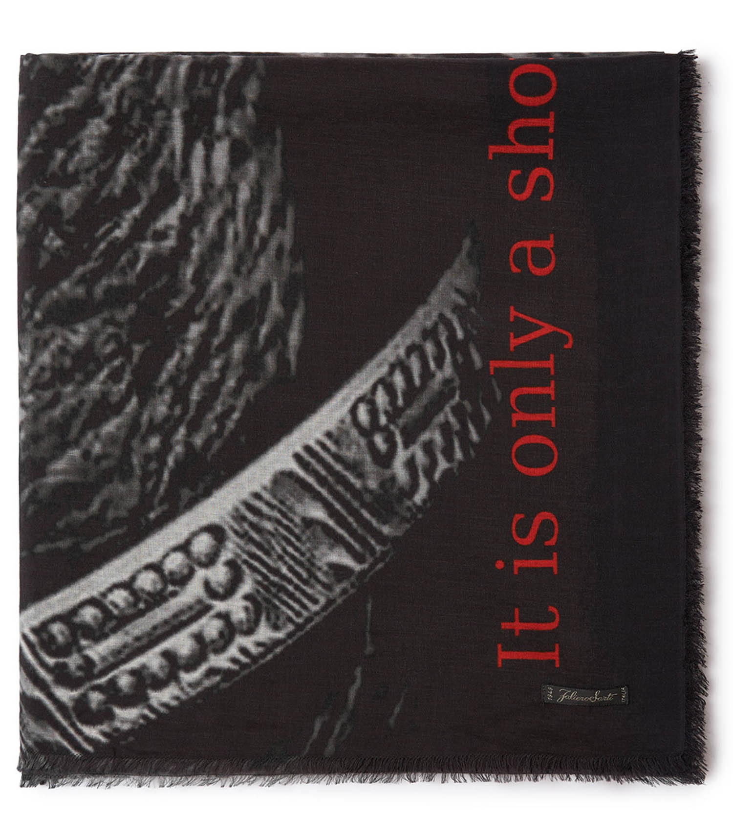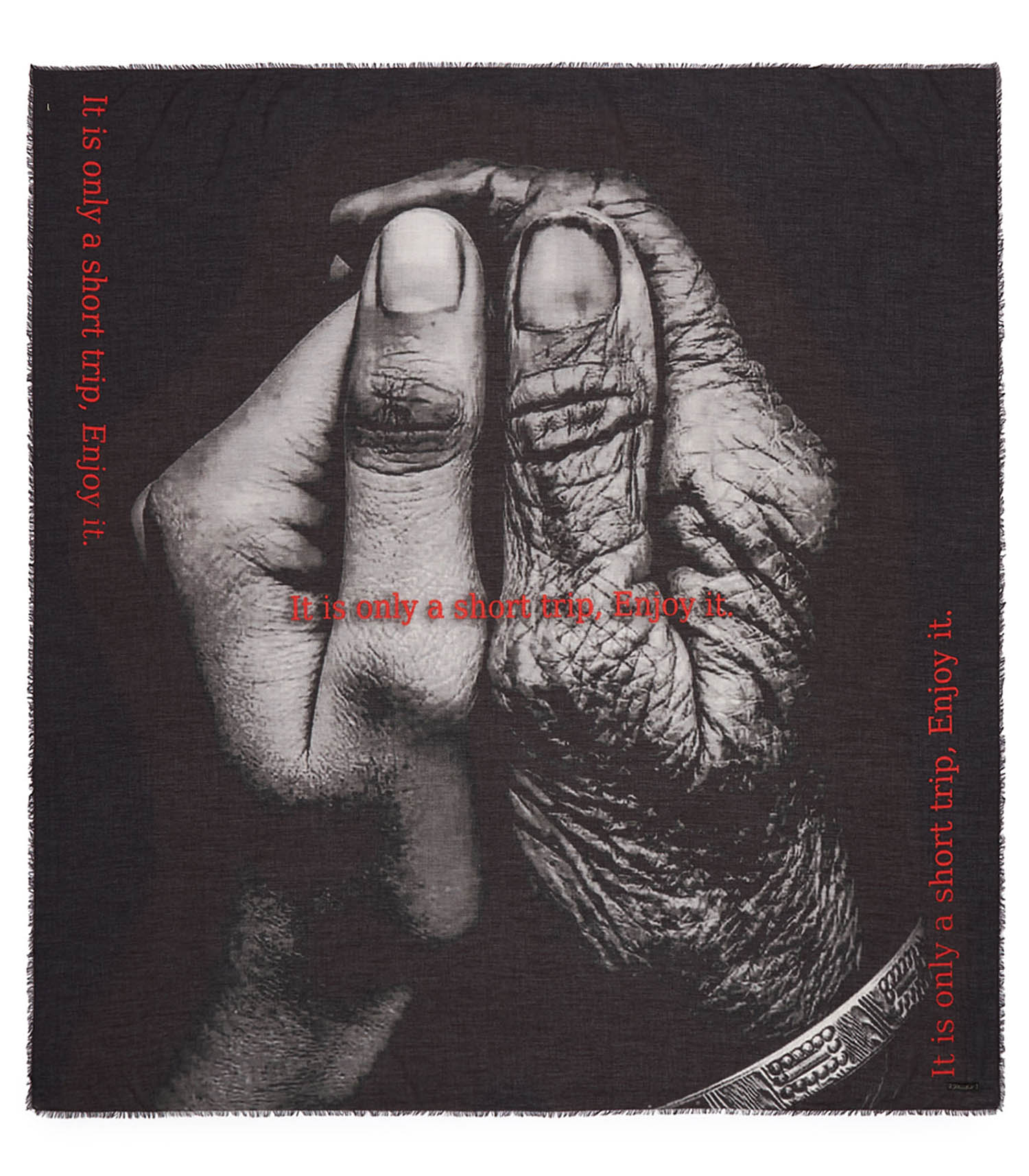 Etole Enjoy de la marque Faliero Sarti. Cette étole carrée se distingue par un imprimé noir et blanc captivant, représentant la main d'une personne jeune accollée à celle d'une personne âgée. Ornée du message "It is only a short trip, enjoy it", elle révèle un vrai message de bienveillance. Sa composition en modal, coton et cachemire lui confère chaleur et douceur.