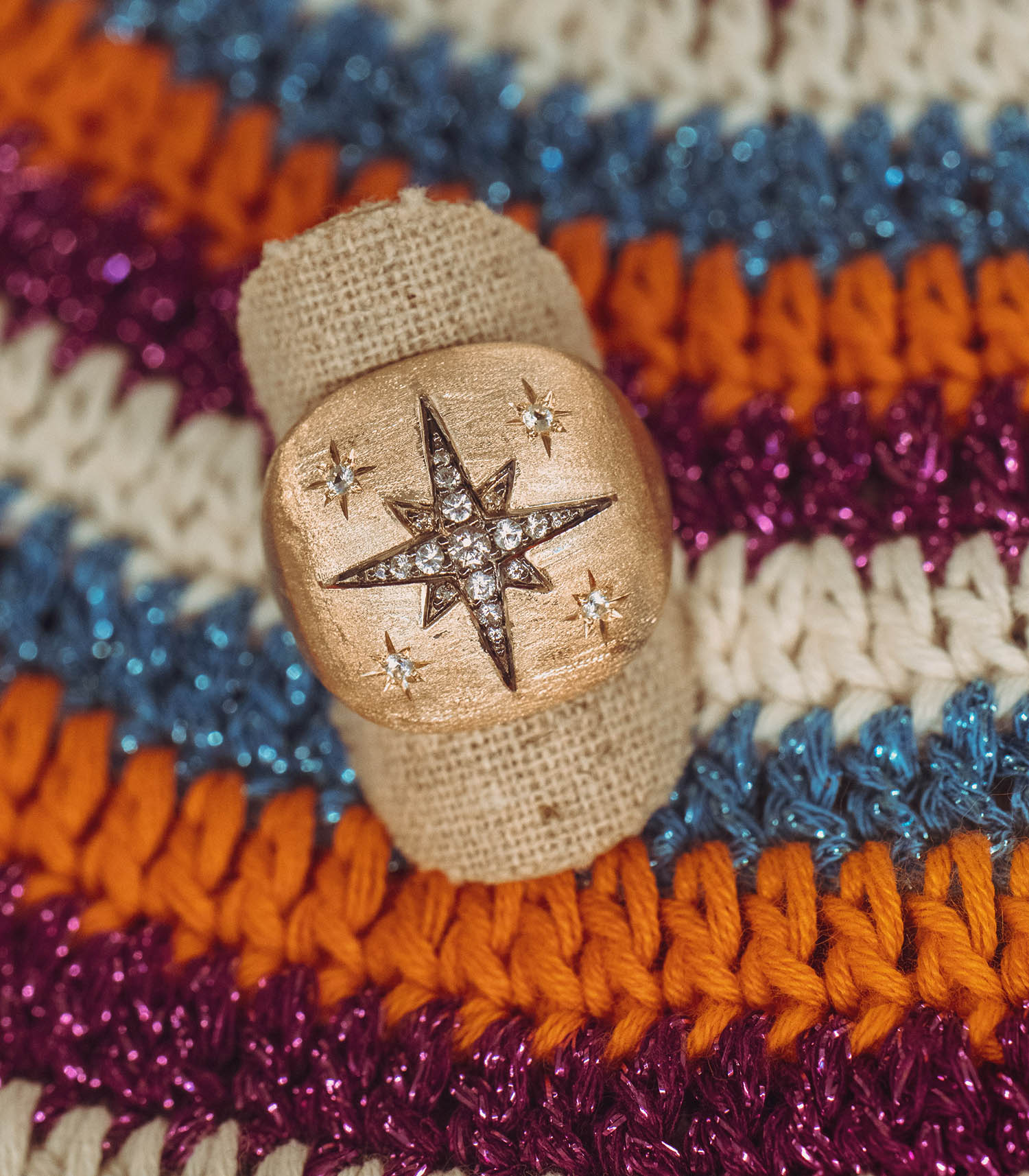 Bague Étoile signée Feidt Paris, une chevalière conçue en or jaune et pavée de 21 saphirs blancs. On la porte seule ou accompagnée d'autres modèles de la marque dans un esprit d'accumulation.