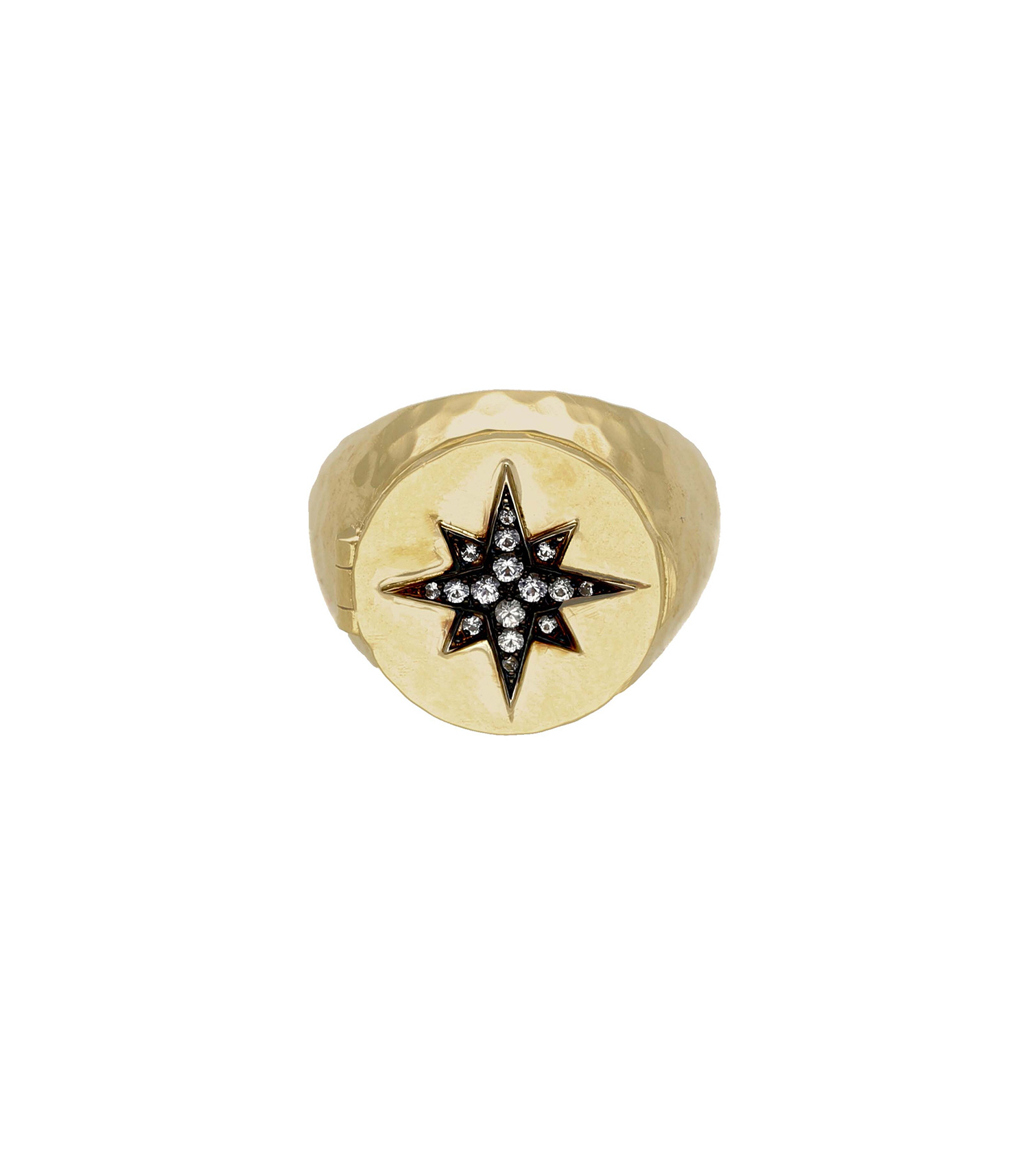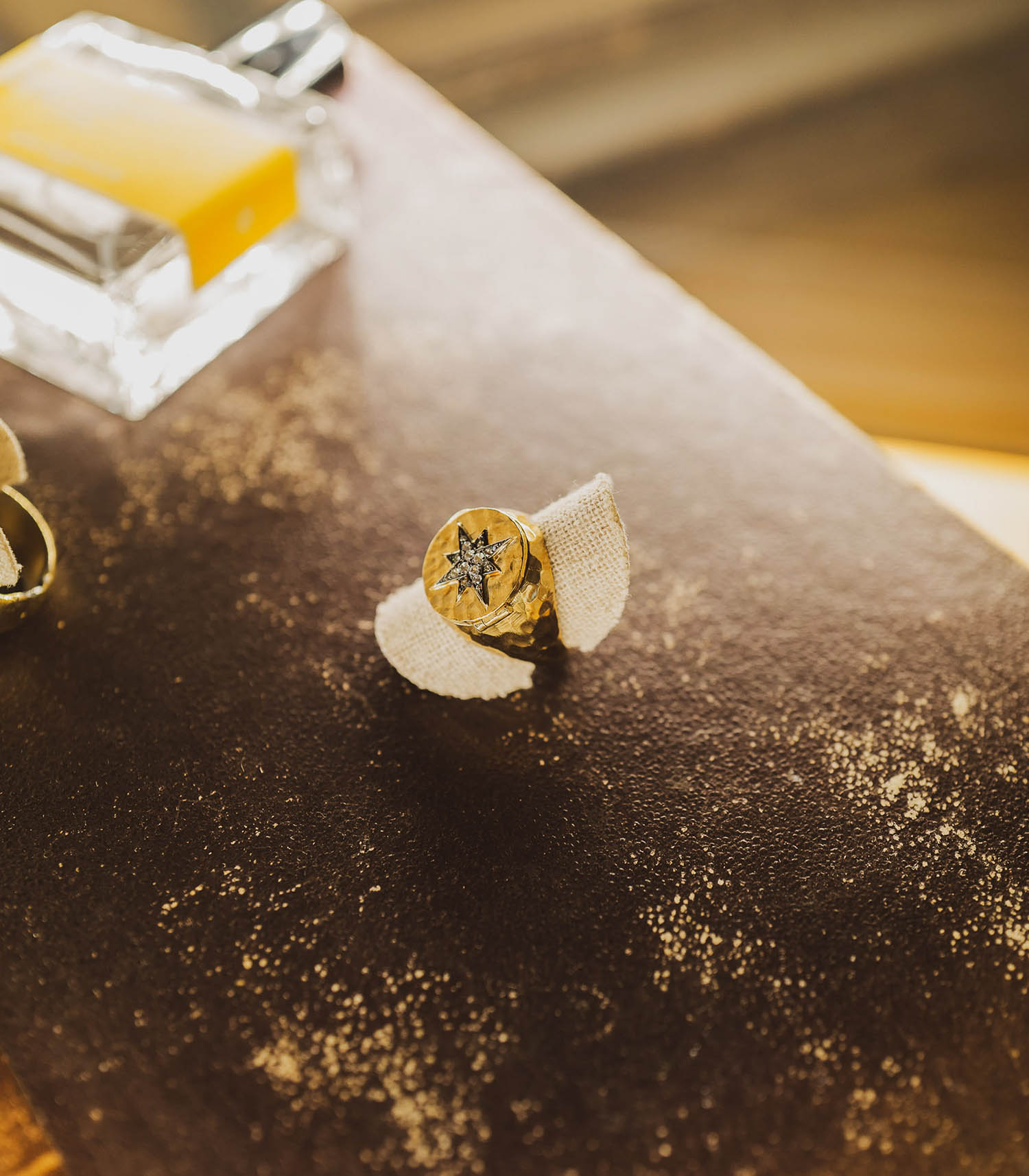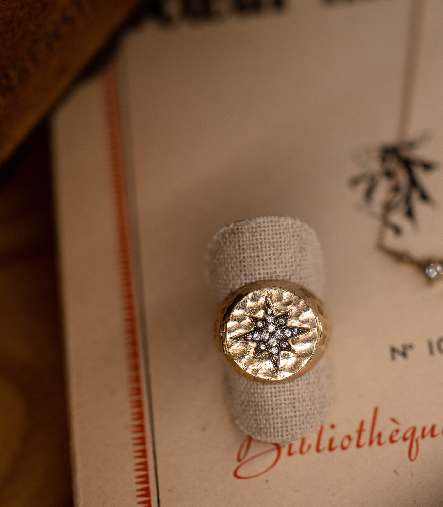 Chevalière Constellation Secret Feidt Paris en or jaune 9 carats, pavée de 16 saphirs blancs. Un bijou précieux et élégant qui durera dans le temps.