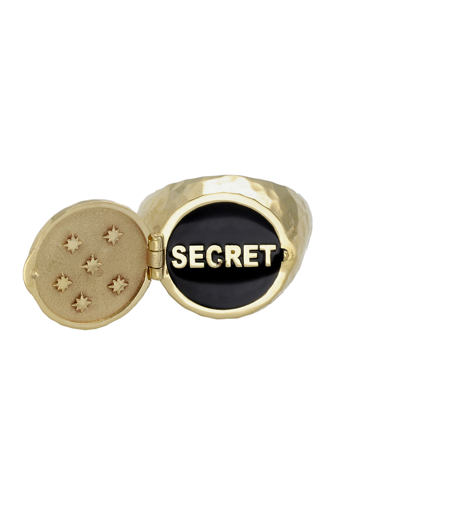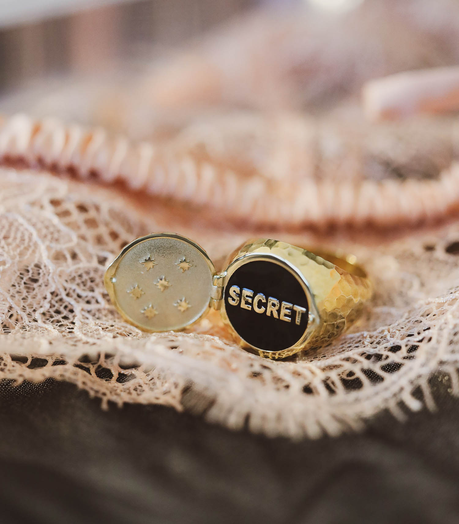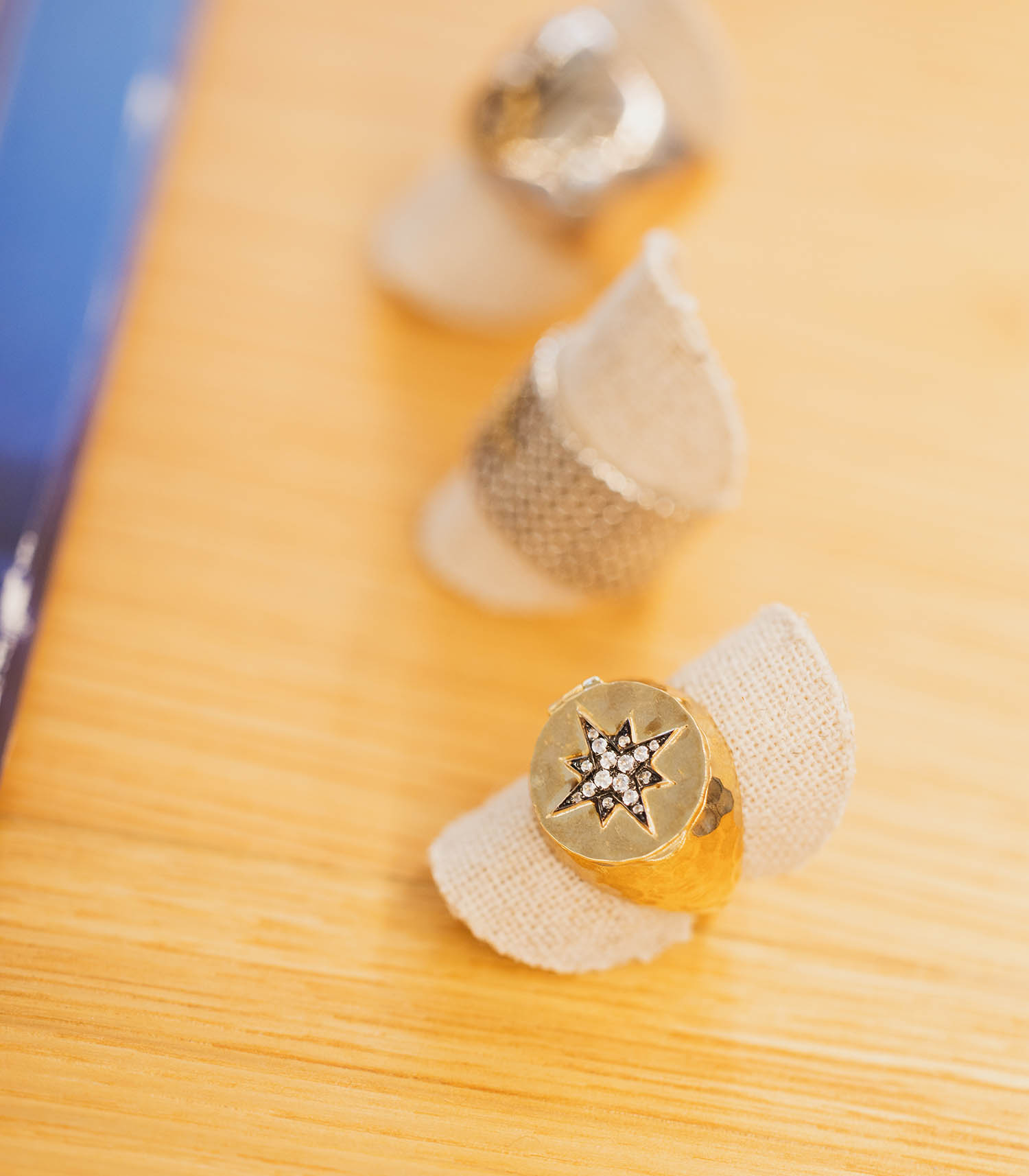 Chevalière Constellation Secret Feidt Paris en or jaune 9 carats, pavée de 16 saphirs blancs. Un bijou précieux et élégant qui durera dans le temps.