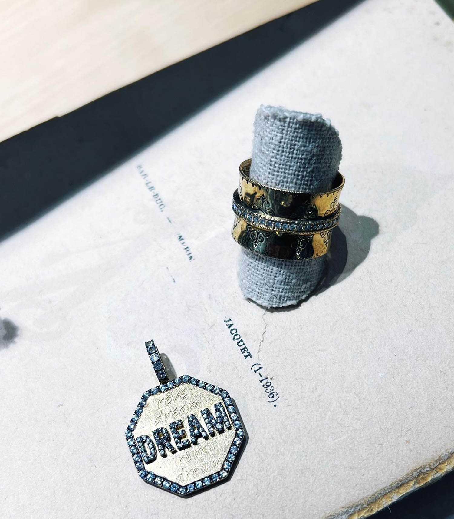 Pendentif Dream par Feidt Paris, conçue en or jaune serti de saphirs blancs et gravée des mots "rêve" et "dream". On l'ajoute sur une chaîne pour venir apporter au décolleté une touche précieuse.