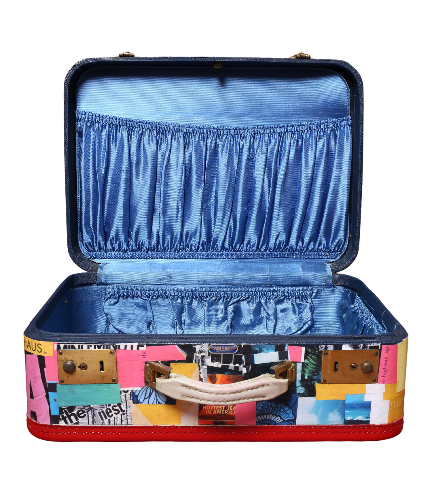 Valise rigide moyenne en toile bleue marine et cuir vernis rouge cerise signée Find Your California, la marque coup de coeur Jane de Boy de cette saison ! Créée par l'artiste et photographe Nico Guilis, la marque regroupe ses trouvailles vintage qu'elle chine et customise selon ses inspirations diverses : mode, surf, logos, wordings inspirants, motifs XXL...