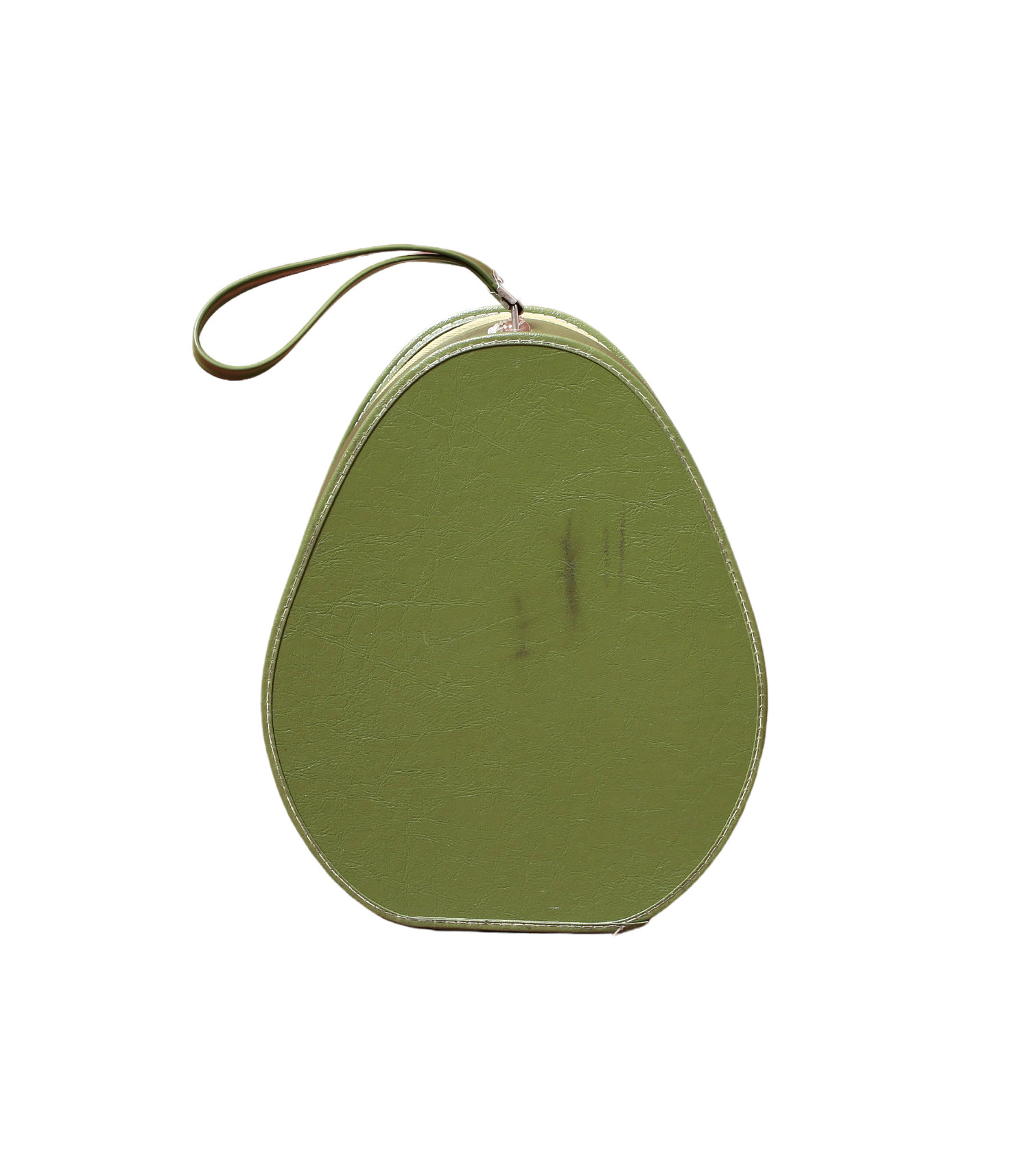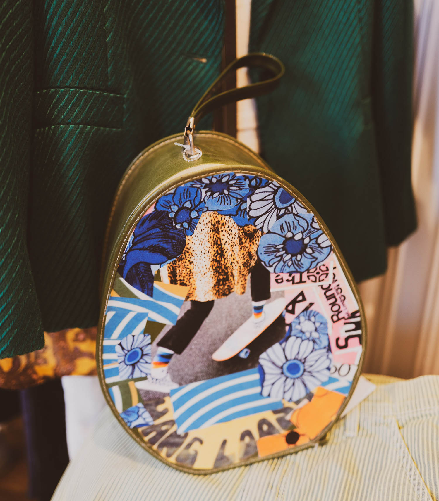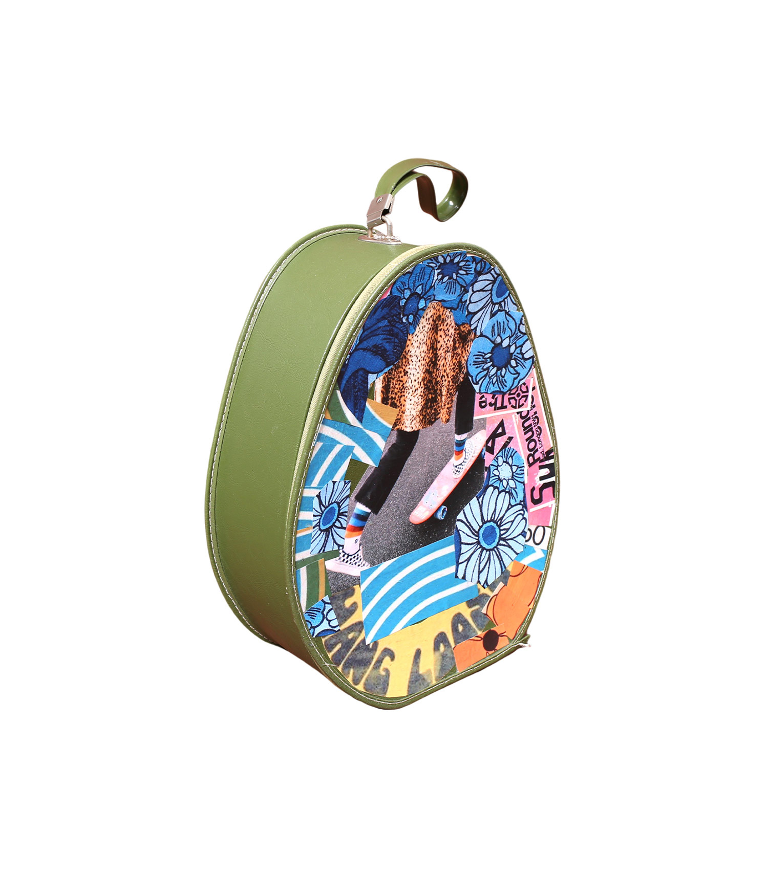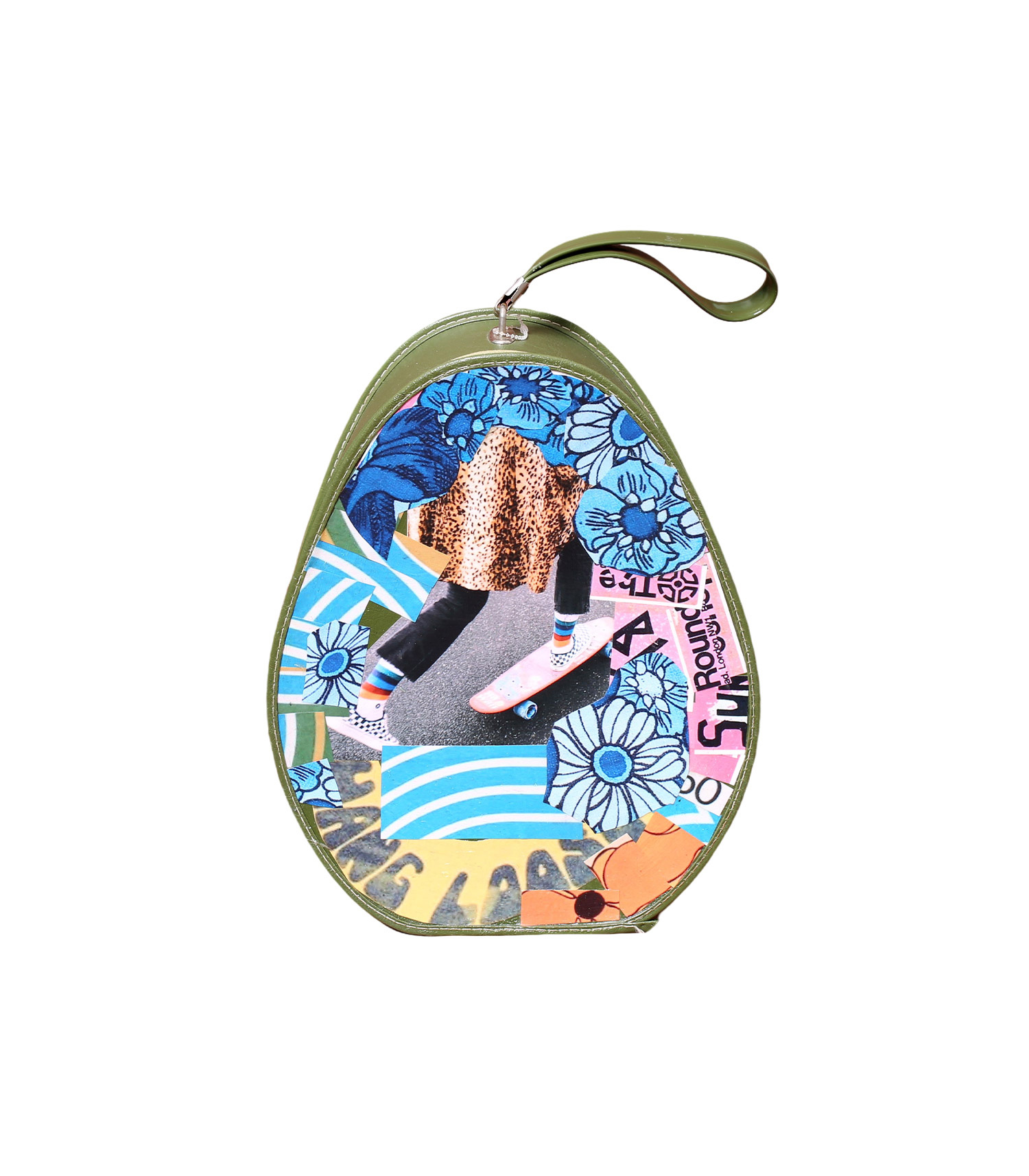 Pièce exclusive et coup de coeur Jane de Boy, ce vanity en cuir kaki est totalement unique et customisée avec des collages d'inspiration 70s : skateboard, motifs fleurs XXL, wordings anglophones... De forme ovale façon poire et doté d'une petite anse sur le haut, il se transporte facilement.