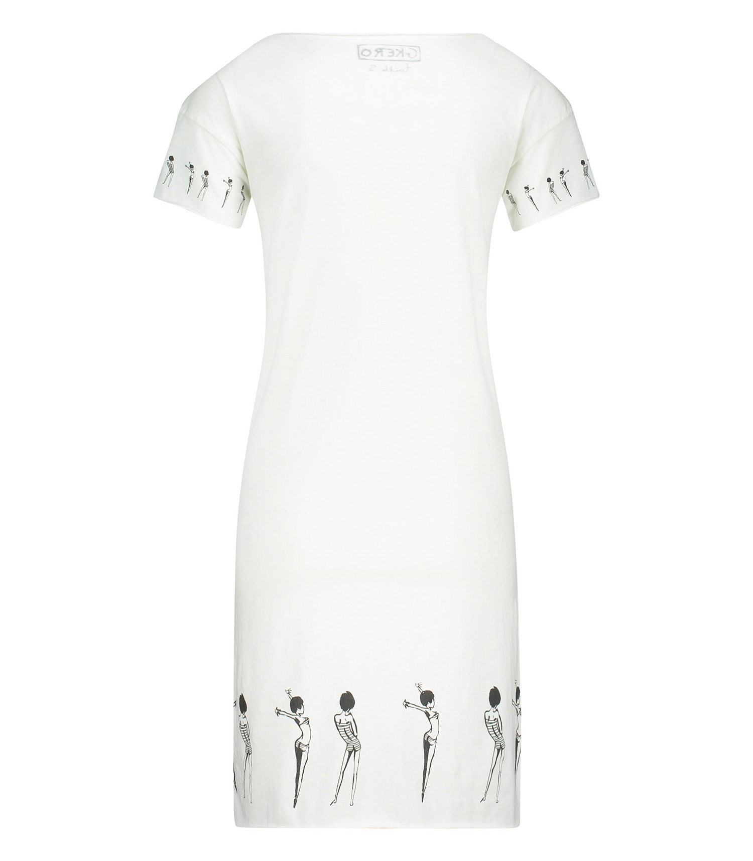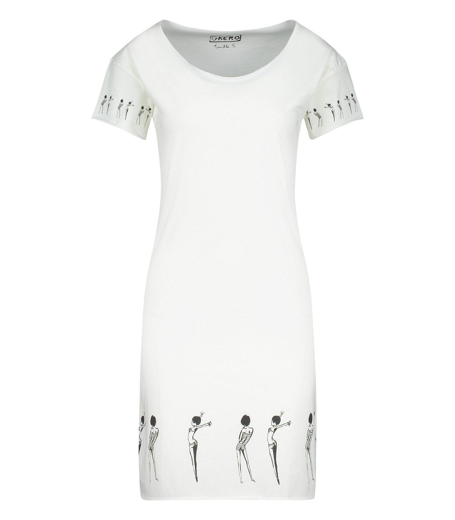 Robe Tee-shirt Bikini Line signée G.Kero, réalisée en exclusivité pour Jane de Boy. Un modèle idéal pour les beaux jours avec sa coupe droite en forme de tee-shirt long et son impression à silhouettes fines aux manches et sur le bas.