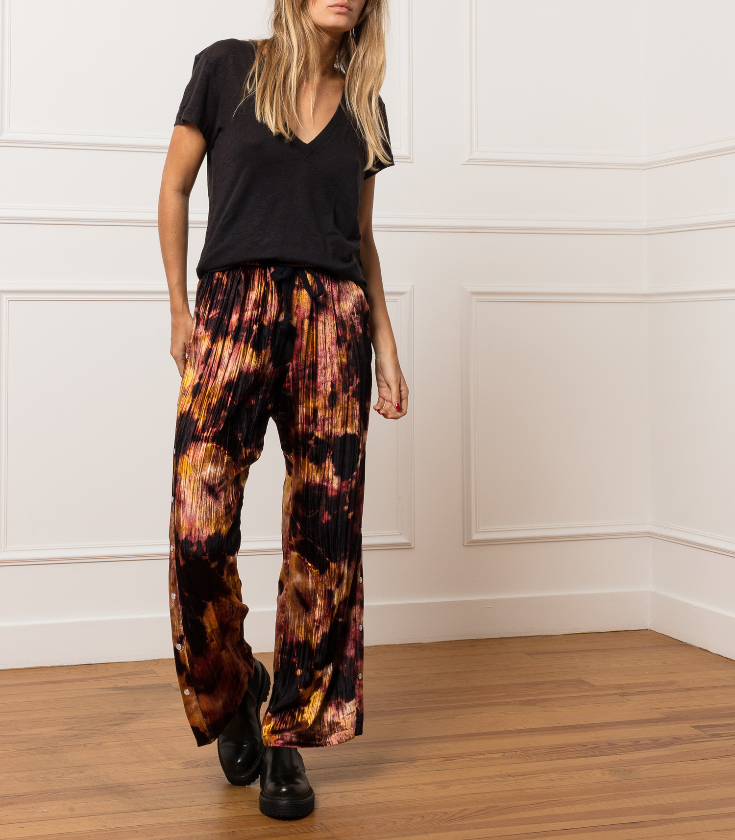 Sublime pièce issue de la collection printemps-été 2021 des collections Garçons Infidèles, le pantalon Chris se pare d'un imprimé tie & dye burgundy envoûtant. Réalisé en velours de viscose et soie, il aborde une coupe fluide légèrement plissée, pour un tombé parfait. Élastique à la taille, est légèrement ample et peut s'ouvrir sur les côtés grâce à des boutons pressions placés sur tout le long de la jambe, façon pantalon de jogging.