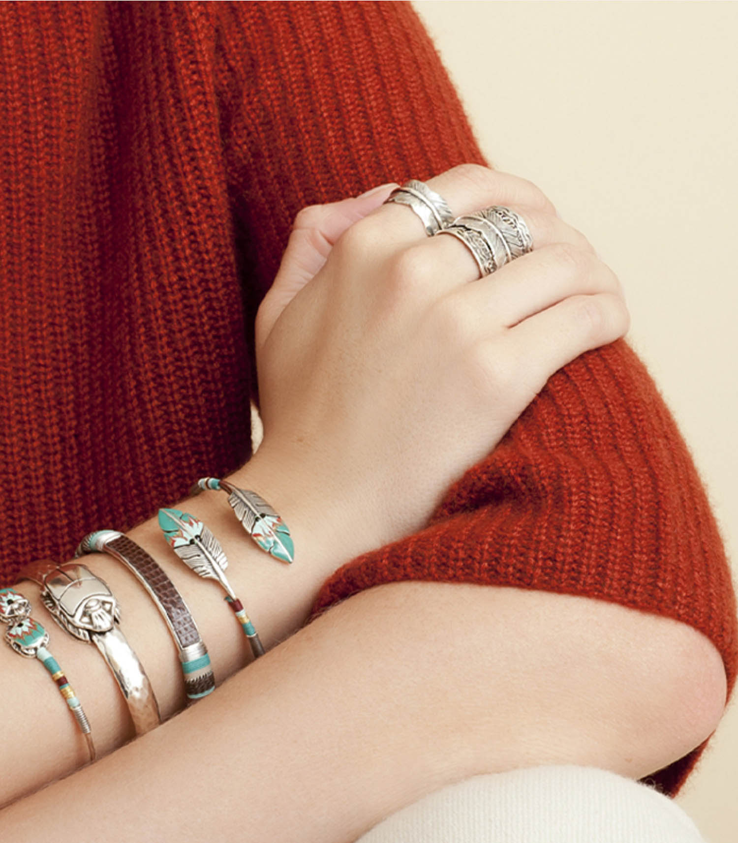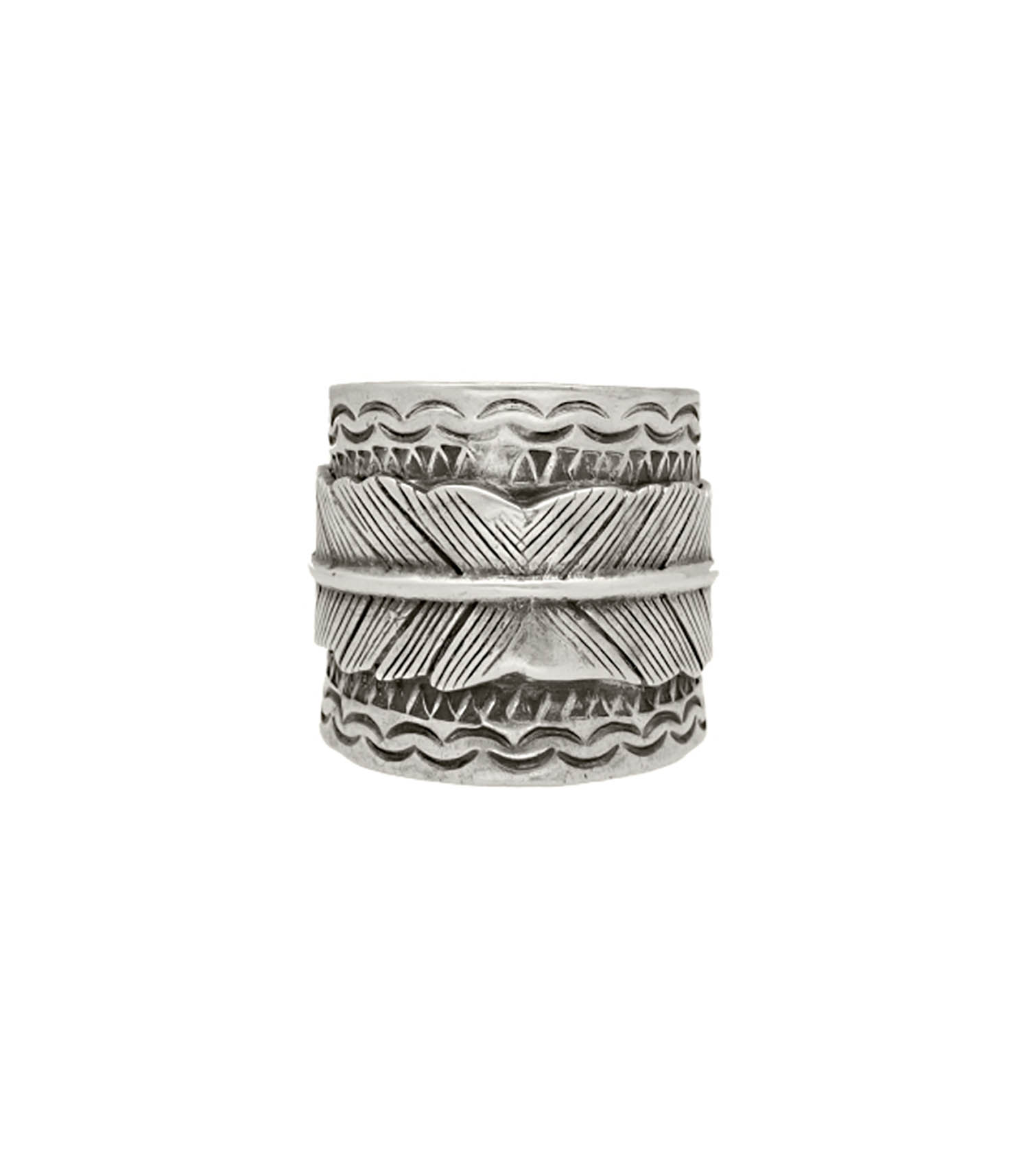 Bague Cancun Penna argent signée Gas Bijoux, un anneau large en métal argenté finement gravé de volutes et habillé d'une plune pour un esprit ethnique. Anneau ouvert et ajustable au doigt.
