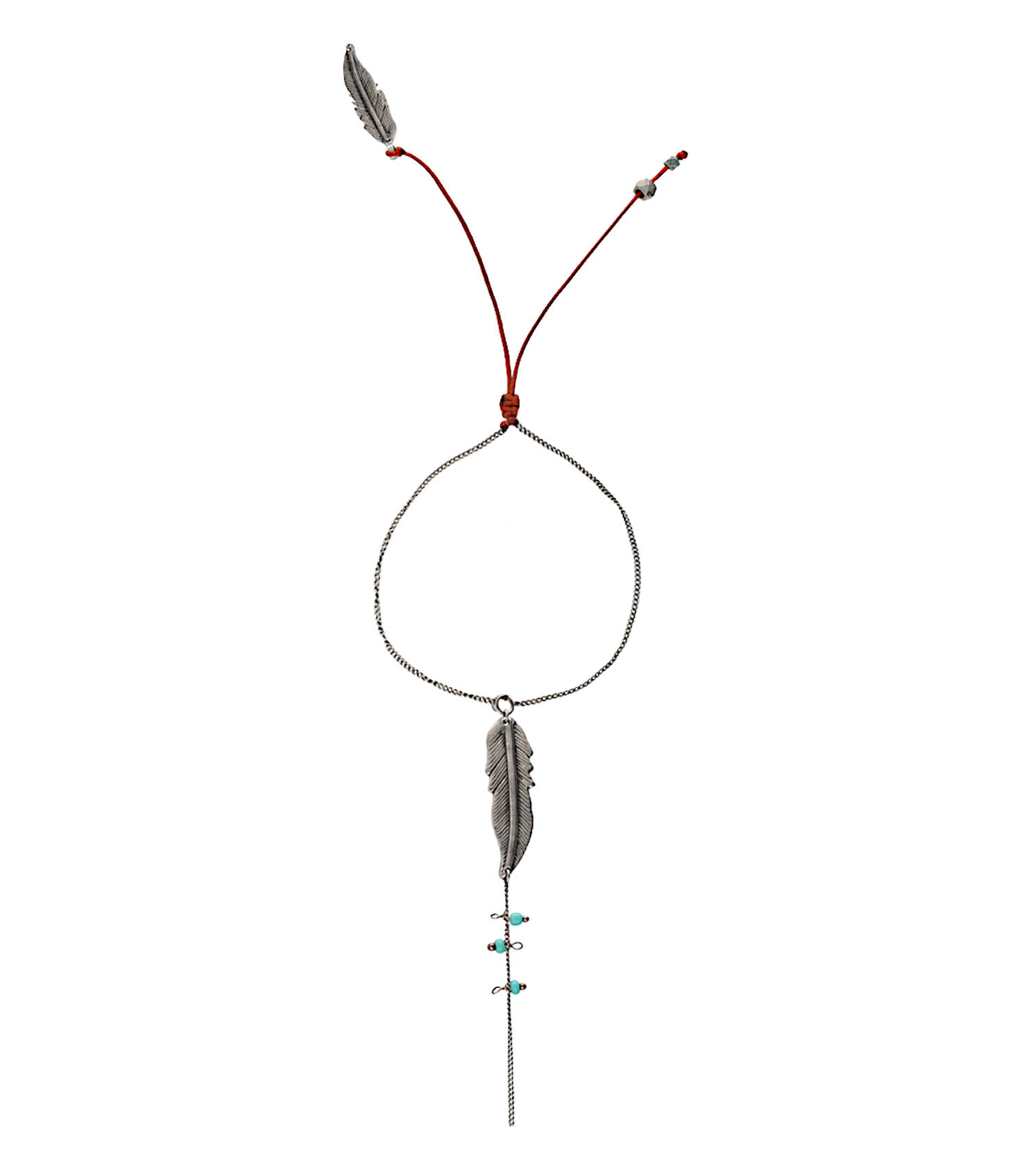 Pour habiller votre main de manière originale, optez pour ce bijou composé d'une fine chaîne argentée, et d'empiècements en forme de plume, de petites perles turquoise et de liens en coton.