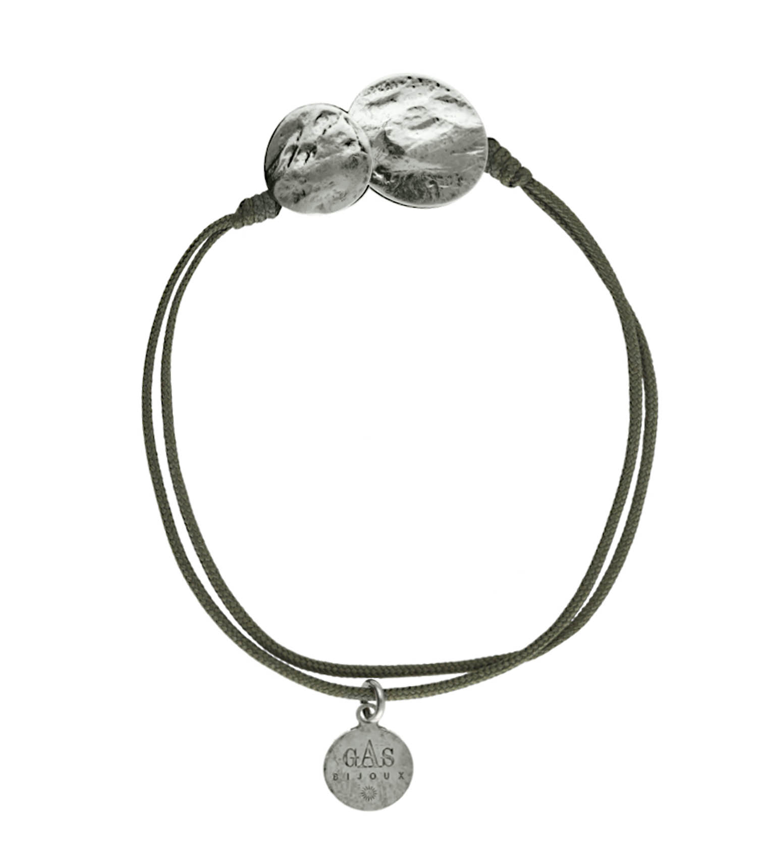 Bracelet platine signé Gas Bijoux en métal argenté, composé d'un lien en coton tressé et de deux petites plaques rondes et martelées en son centre. Un bijou à l'esprit authentique.