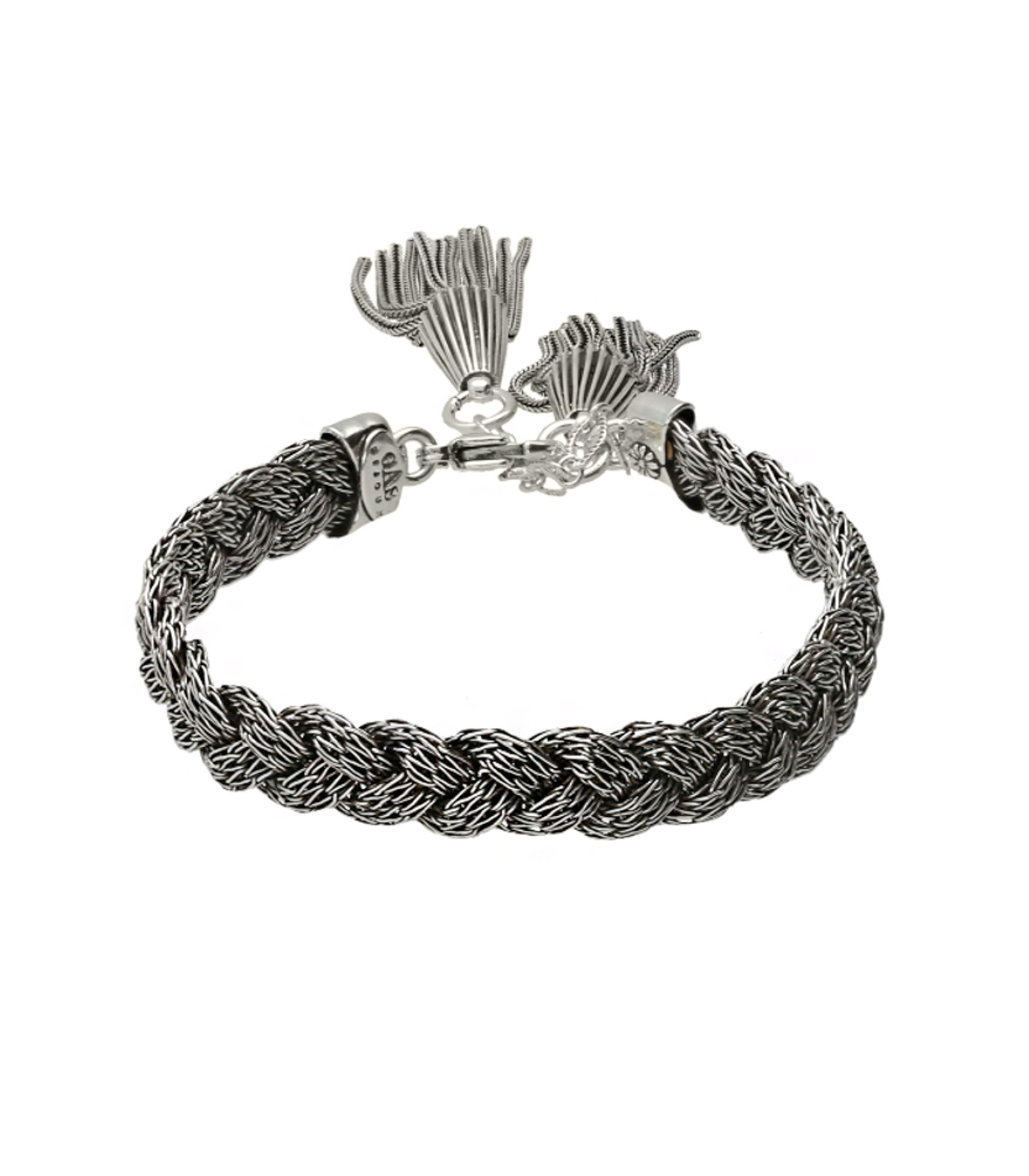 Bracelet tressé souple argenté de la marque Gas Bijoux, formé d'un fin assemblage de chaînes tressées. Ses extrémités sont ornées de ponpoms décoratifs et mobiles. Longueur ajustable grâce à une petite chaîne de réglage.