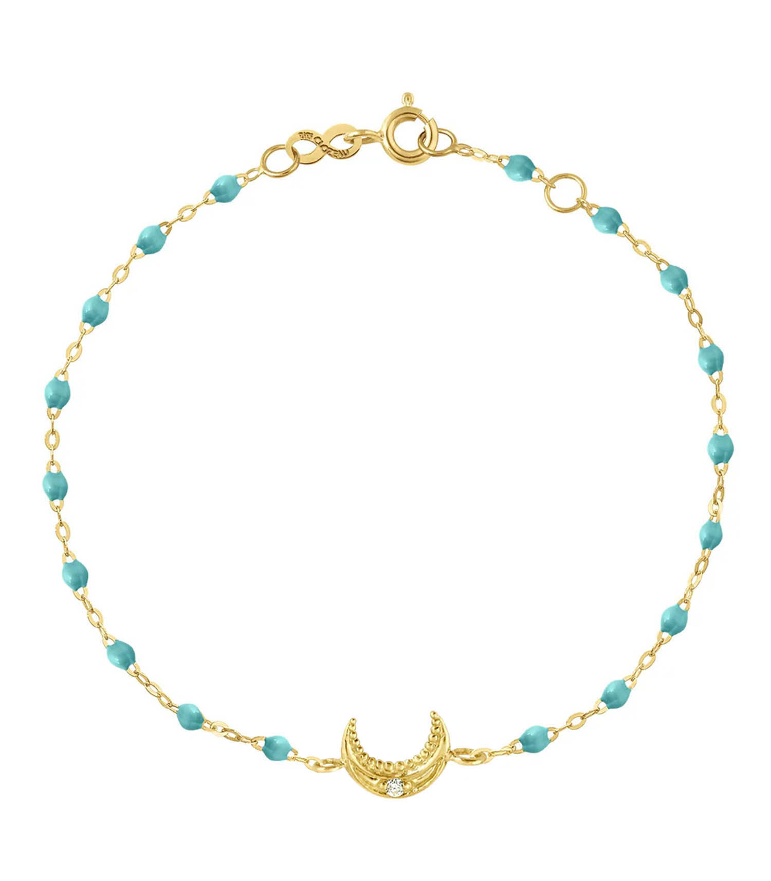 Bracelet Lune Diamant or jaune signé Gigi Clozeau. La nuit tombée, la lune Gigi brille discrètement dans le ciel étoilé. L'étoile gigi, la lune, la clé, l'étoile de David… Voici les trésors de la collection "pirate". Des bijoux découverts dans le coffre-fort d'un navire. Bracelet Lune , 1 diamant, or 18 carats et élégantes perles de resine.