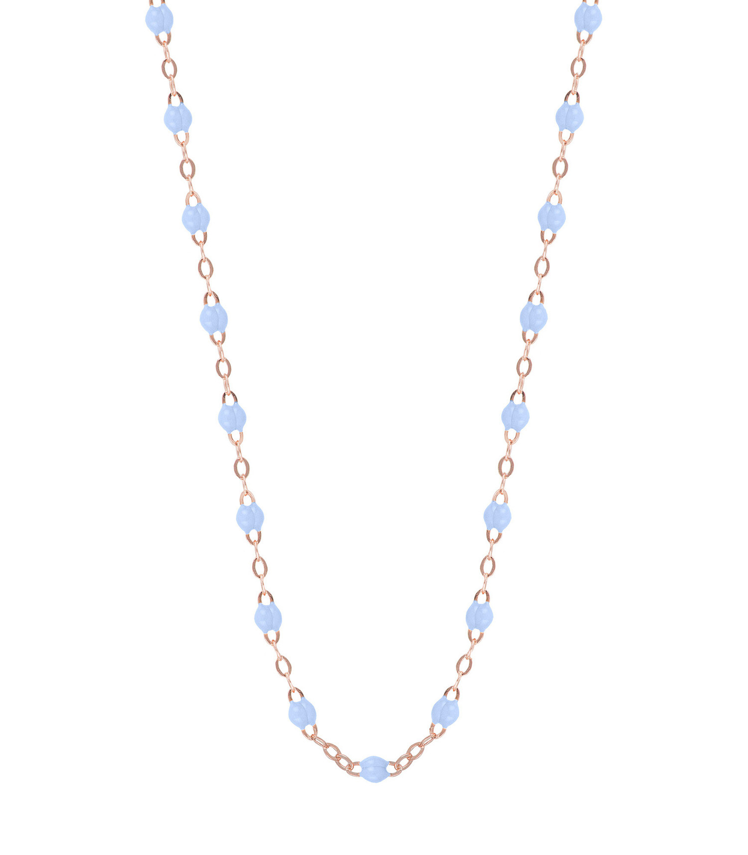Comme ce collier or rose et perles de résine 50 cm, les bijoux Gigi Clozeau se portent en gris-gris du quotidien. On révèle ce collier en l’associant à un pantalon tailoring et une chemise fluide.
