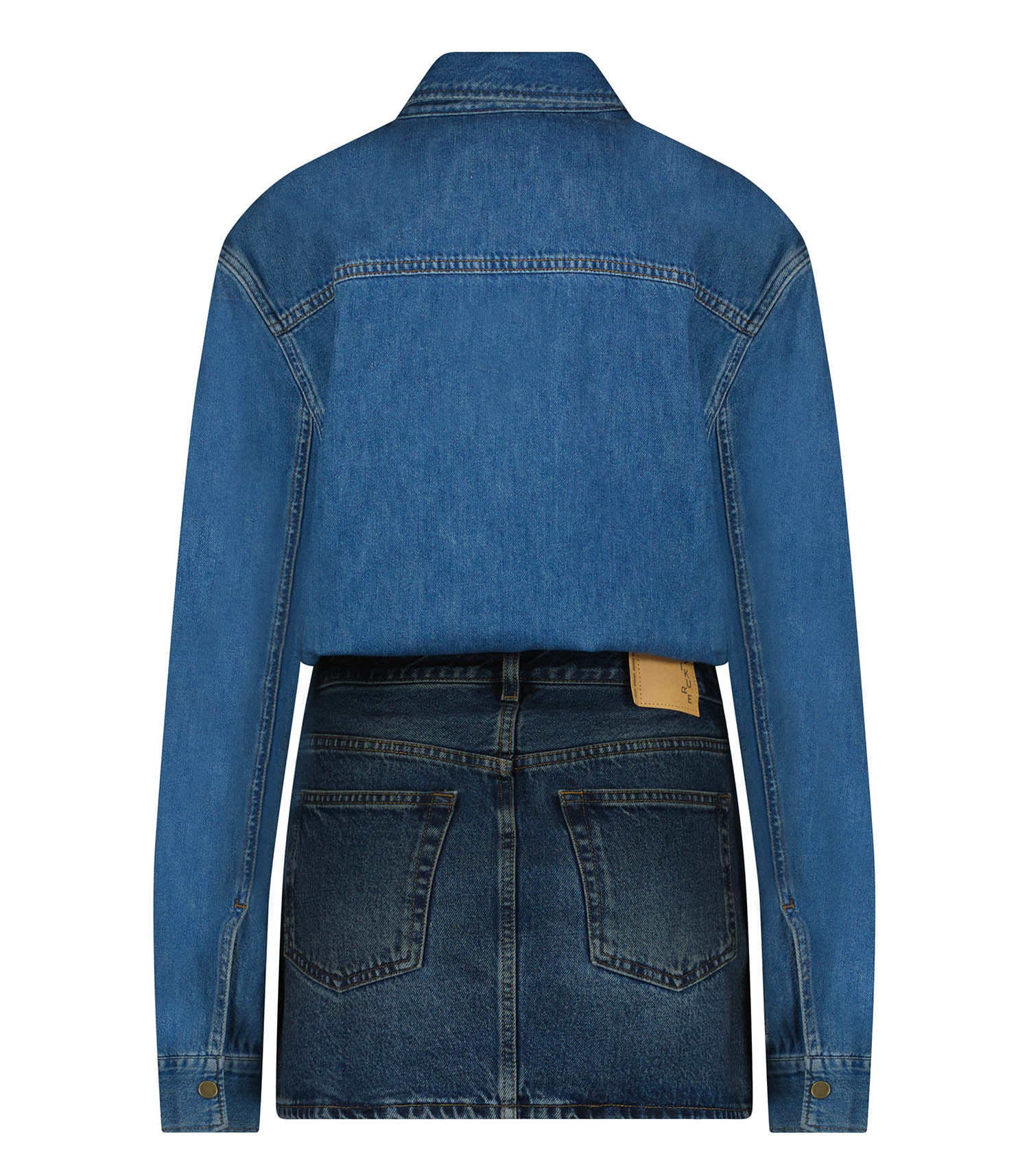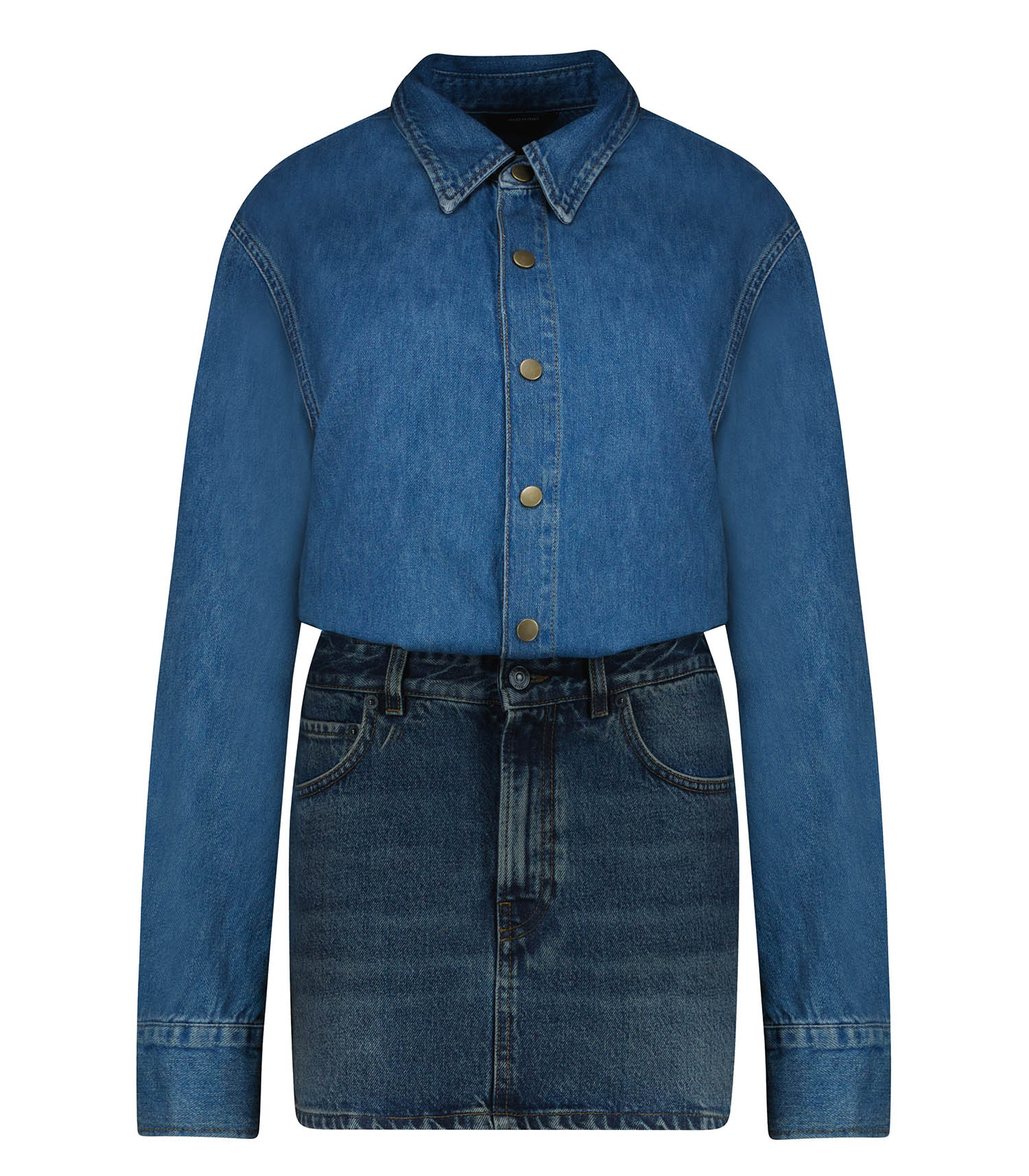 Robe Tia Oil Blue de la marque Haikure. Confectionnée en denim mi-lourd non extensible, cette robe présente une longueur mini qui met en valeur votre silhouette avec élégance. Le col à collerette ajoute une touche de sophistication classique, tandis que les manches longues, ornées de poignets à boutons-pression, offrent un détail pratique et stylé. La patte de boutonnage partielle et la fermeture à boutons, complétée par une braguette zippée, assurent un ajustement parfait.