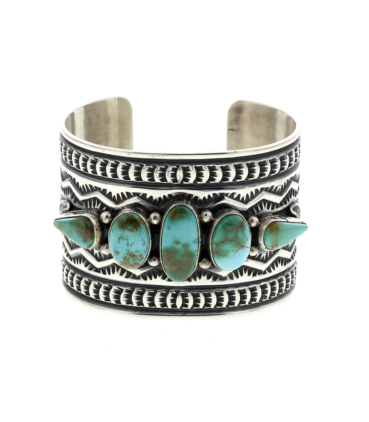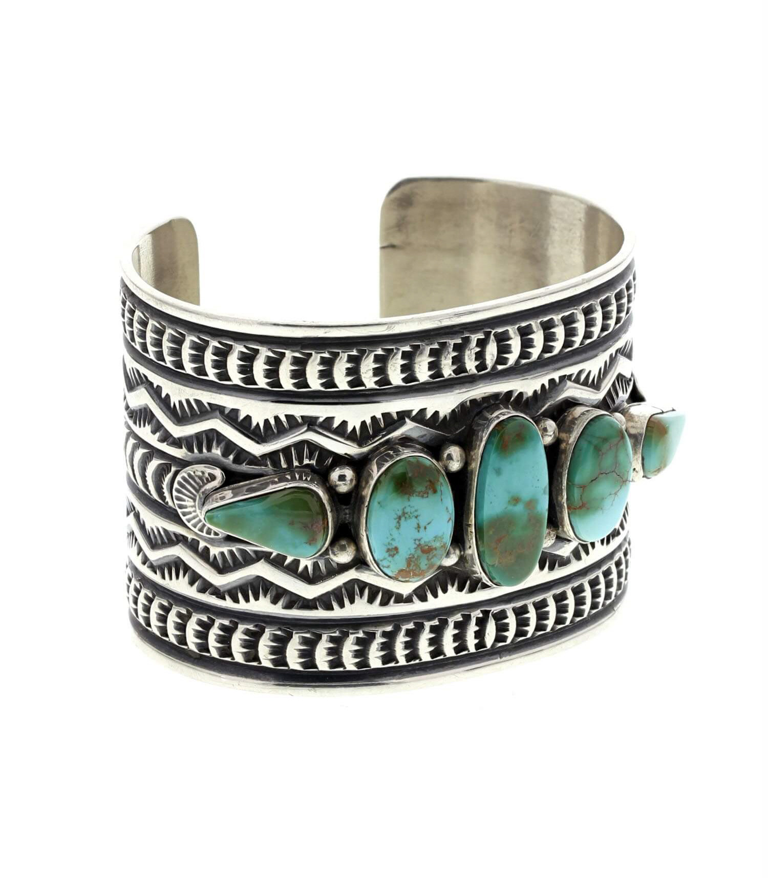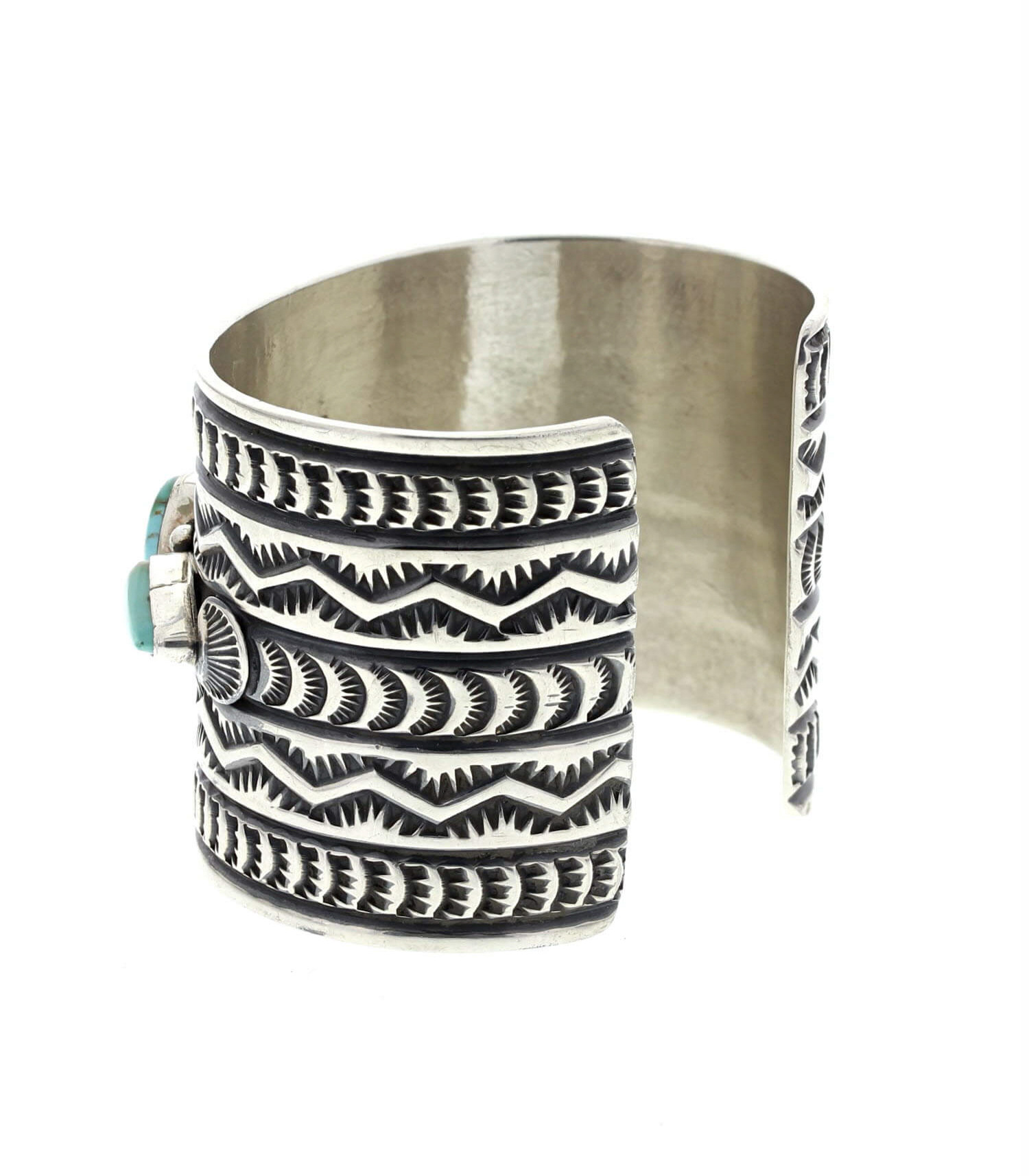 Manchette gravée Harpo en argent gravé 925 muni de cinq turquoises d'une largeur de 1,3 à 1,5 centimètres.Largeur du bracelet: 4,3 cm.