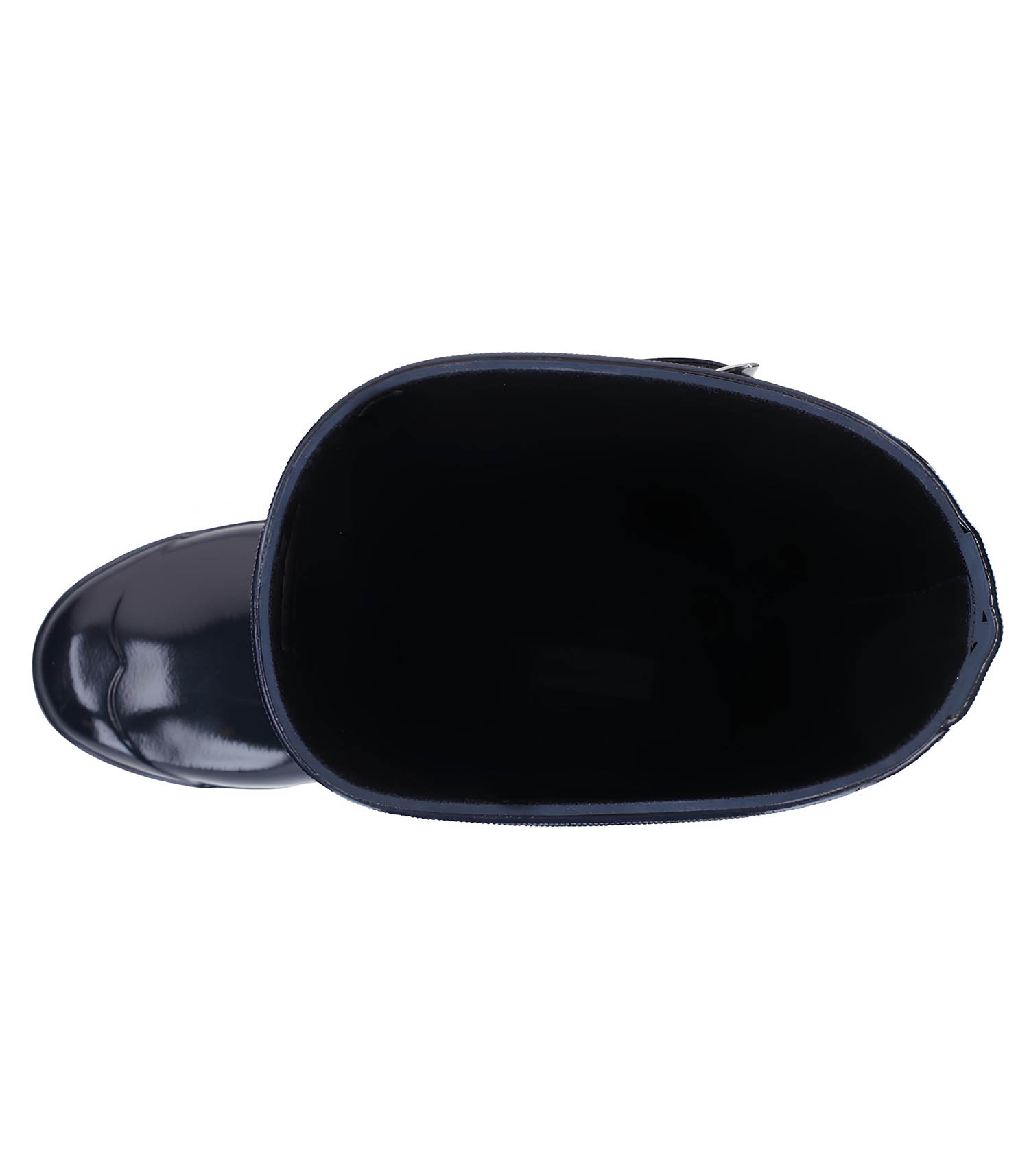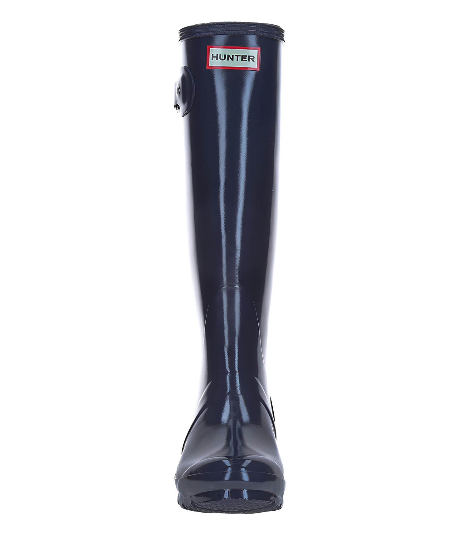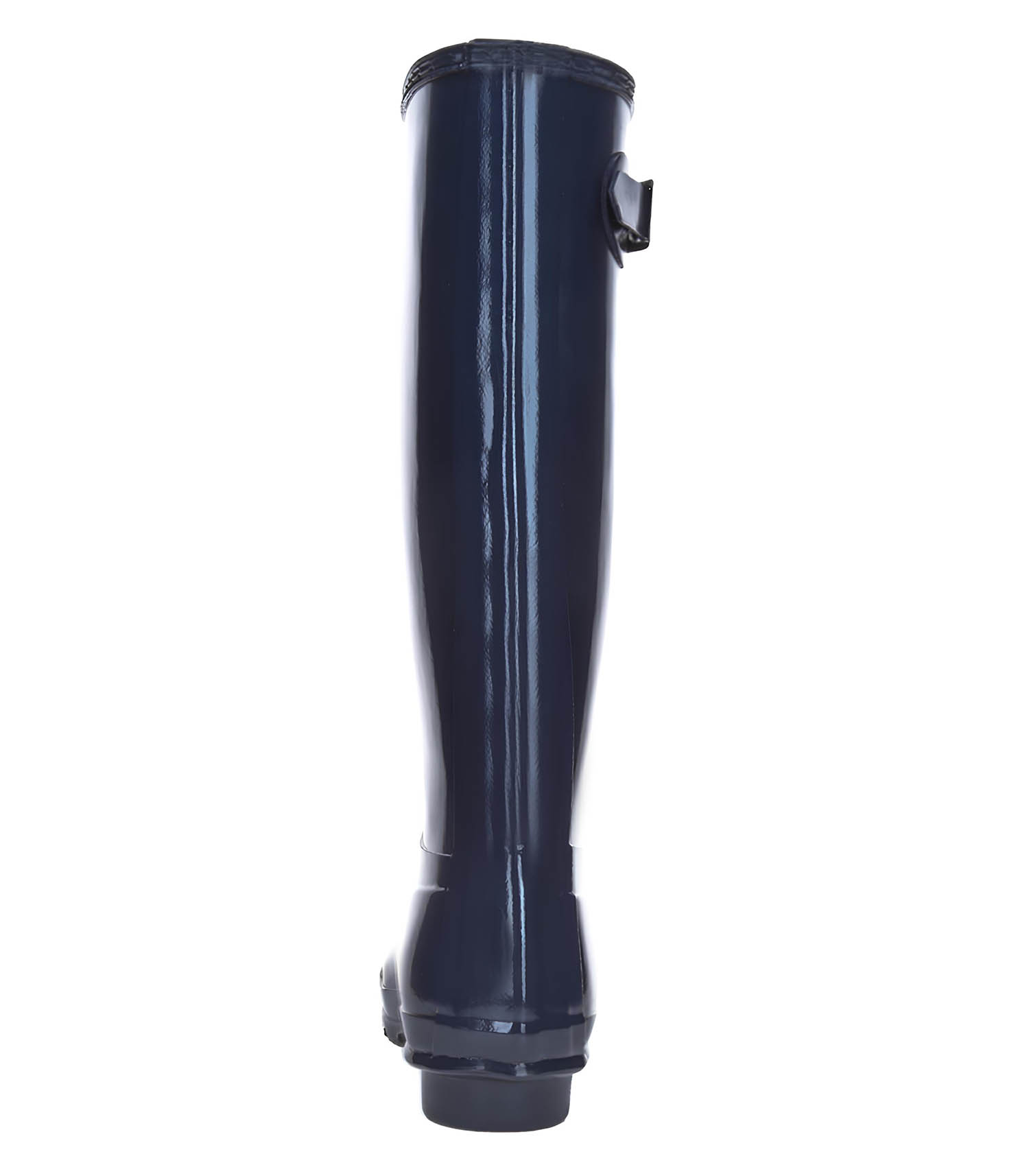 Bottes Original Tall Gloss Navy signées Hunter. Fabriquées en caoutchouc naturel, chaque paire est composée de 28 pièces découpées à la main et assemblées sur une forme en aluminium sur mesure, puis vulcanisées pour une protection maximale contre la pluie. Ces bottes brillantes sont indispensables pour les jours pluvieux.