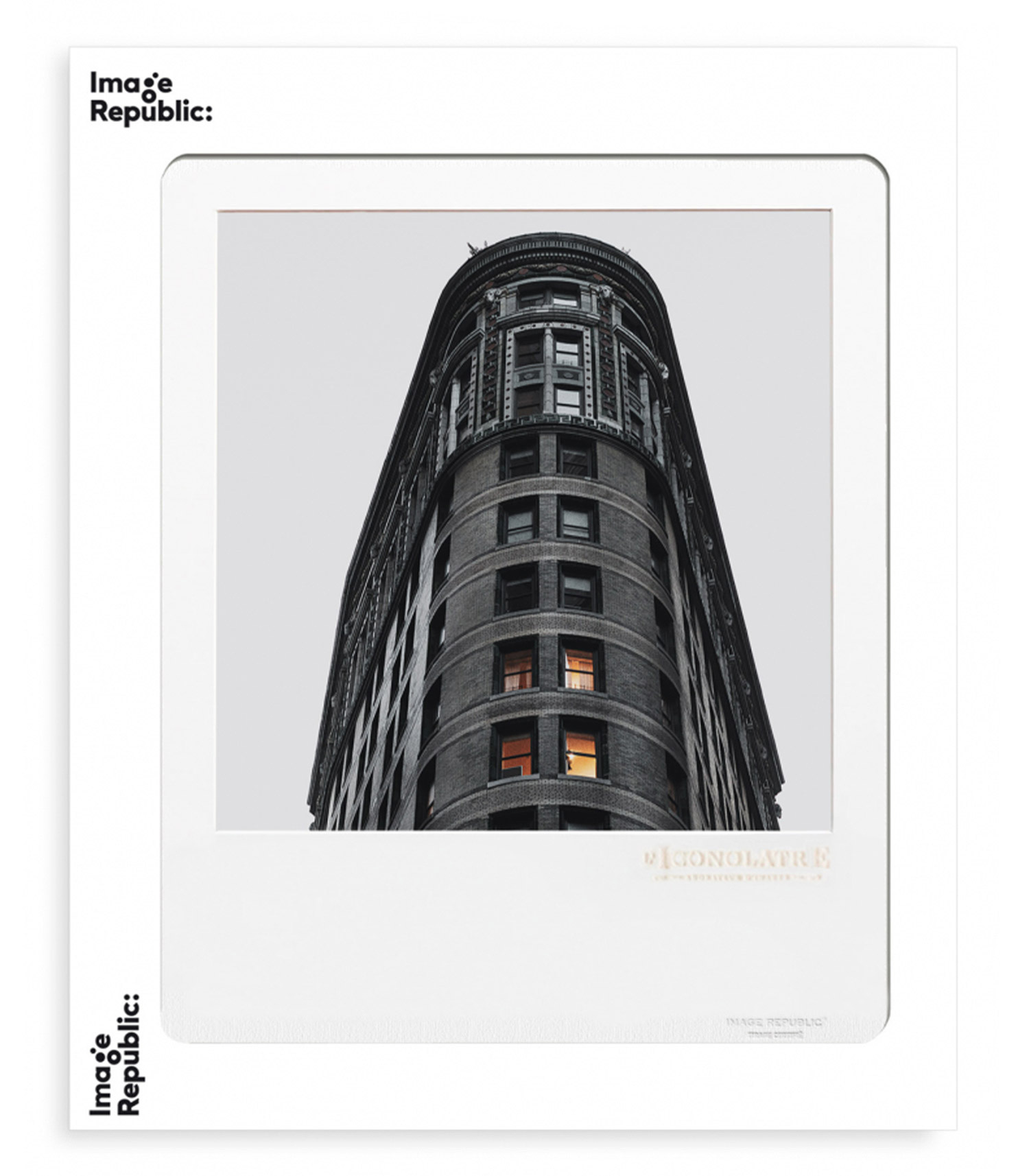 Affiche L'Iconolâtre éditée par Image Republic, représentant le fameux Immeuble Flat Iron de New York, pris en contre plongée pour accentuer la perspective.