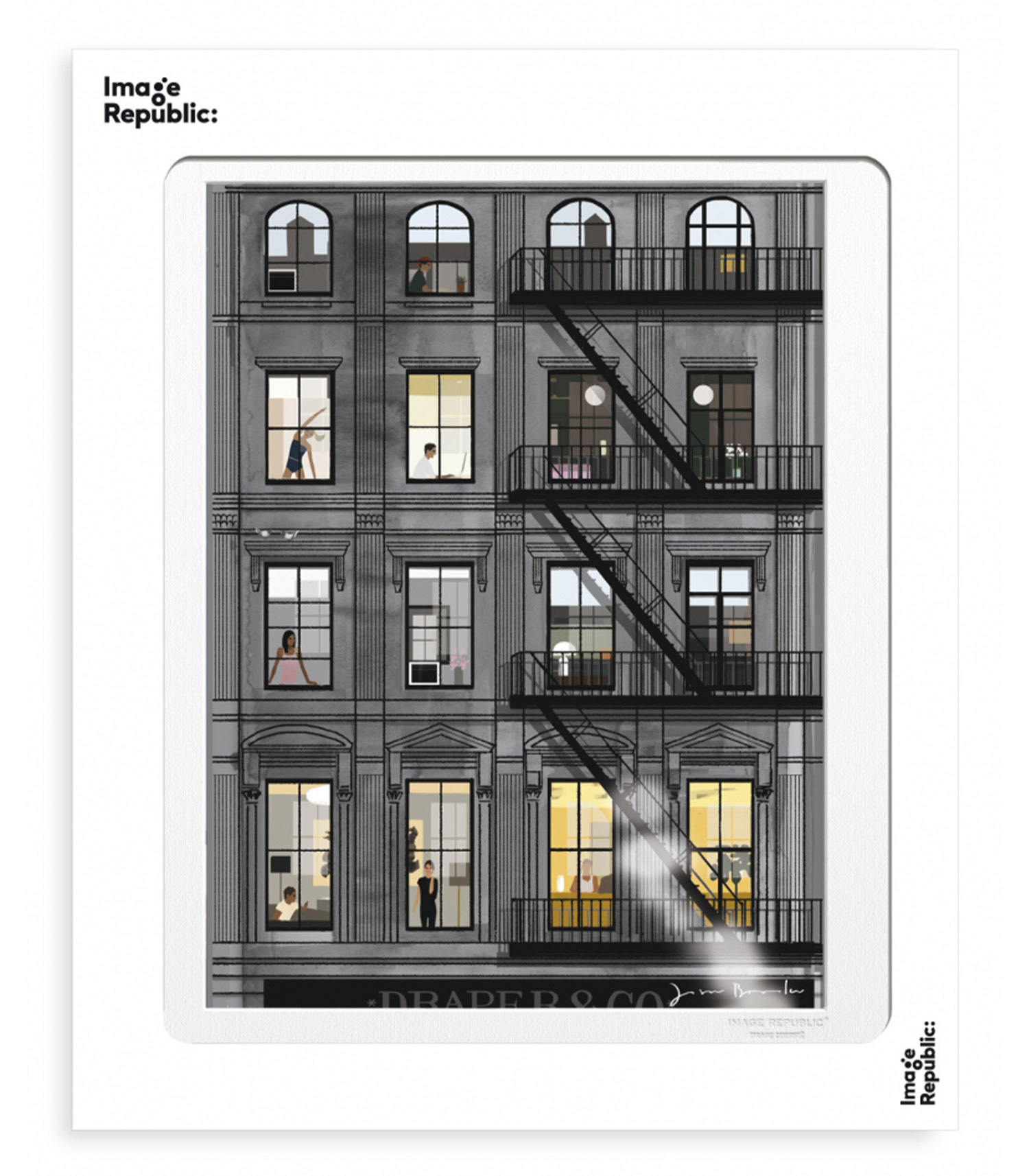 Tout le caractère moderne et graphique des illustrations de Jason Brooks transpire dans cette oeuvre intitulée Manhattan, qui représente la façade d'un immeuble typiquement new-yorkais avec ses escaliers de secours et la vie qui se présente aux fenêtres des habitants de l'immeuble.