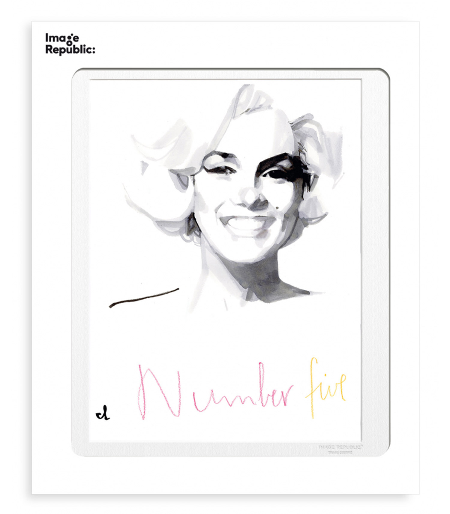 Affiche Portrait MN02 éditée par Image Republic, une jolie illustration abstraite d'un portrait de Marilyn Monroe en noir & blanc accompagnée du wording "Number Five" coloré comme inscrit au crayon pastel. Une illustration signée de l'artiste Marc Antoine Coulon.