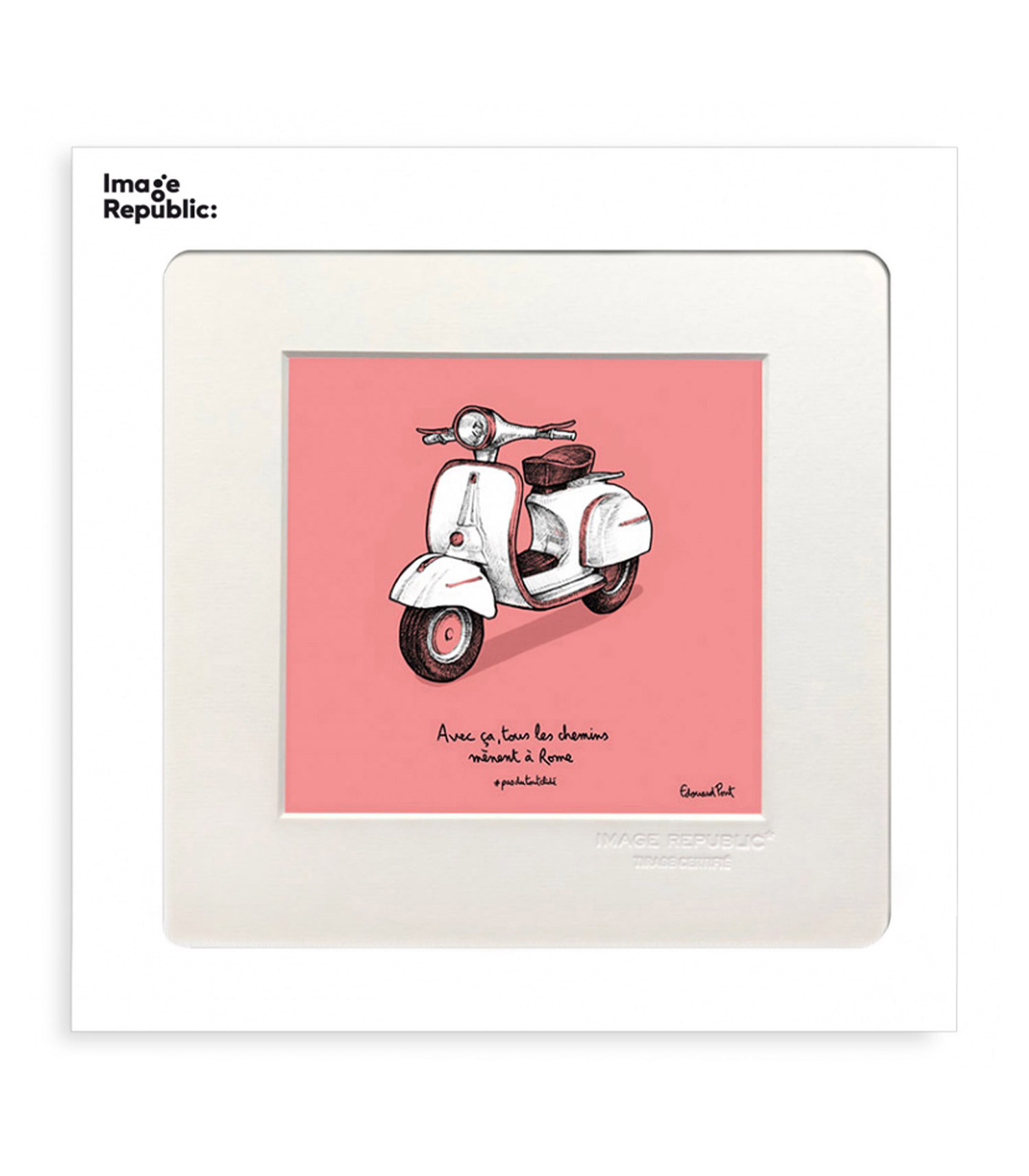 Affiche Pas du tout cliché Scooter éditée par Image Republic qui illustre un scooter Vespa sur fond rose accompagné de la phrase "Avec ça, tous les chemins mènent à Rome. #pasdutoutcliché"