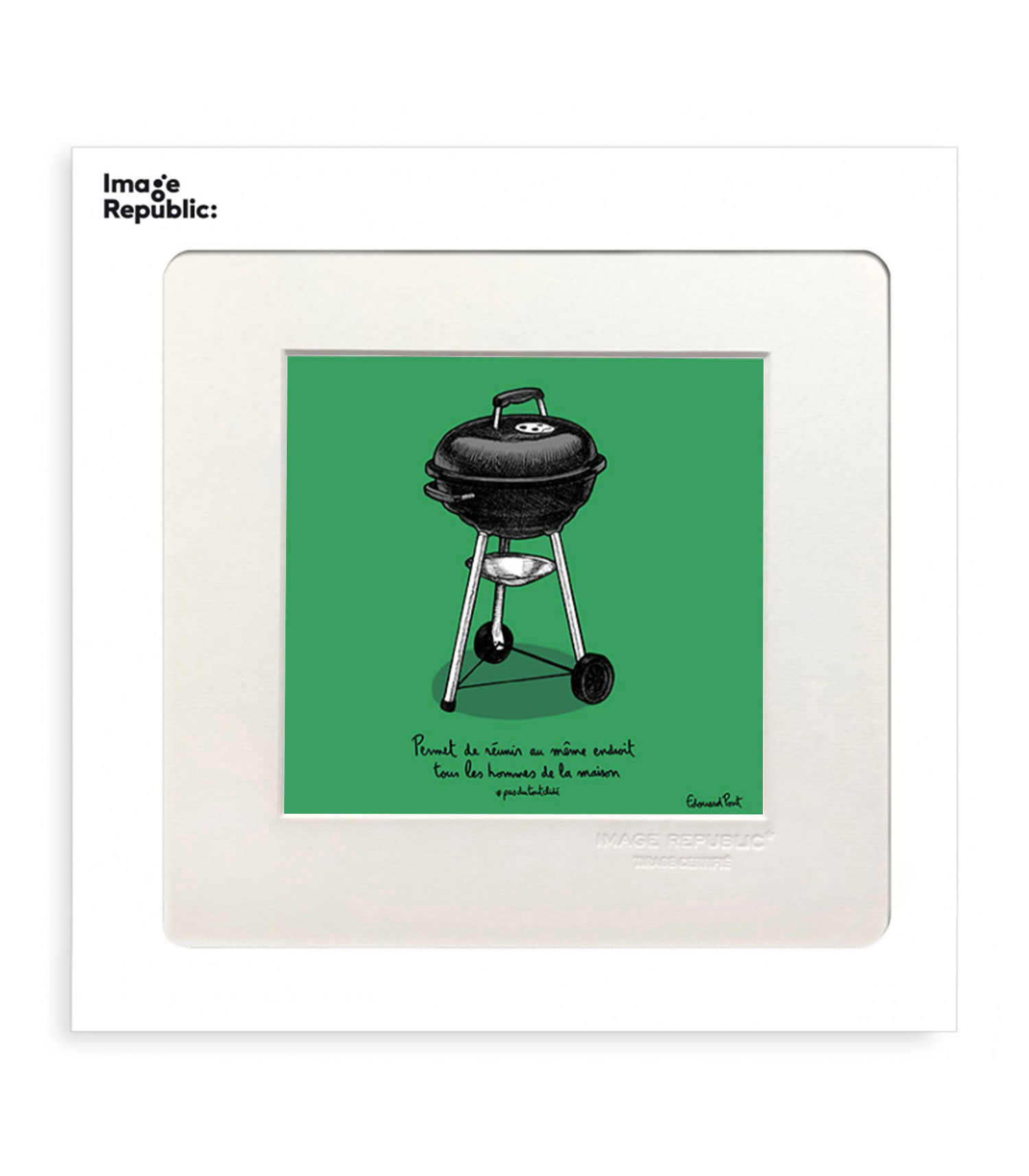 Affiche PDTC Edouard Pont 086 barbecue couleur éditée par Image Republic. Une affiche pleine d'humour représentant un barbecue accompagné de l'inscription "Permet de réunir au même endroit tous les hommes de la maison #pasdutoutcliché".
