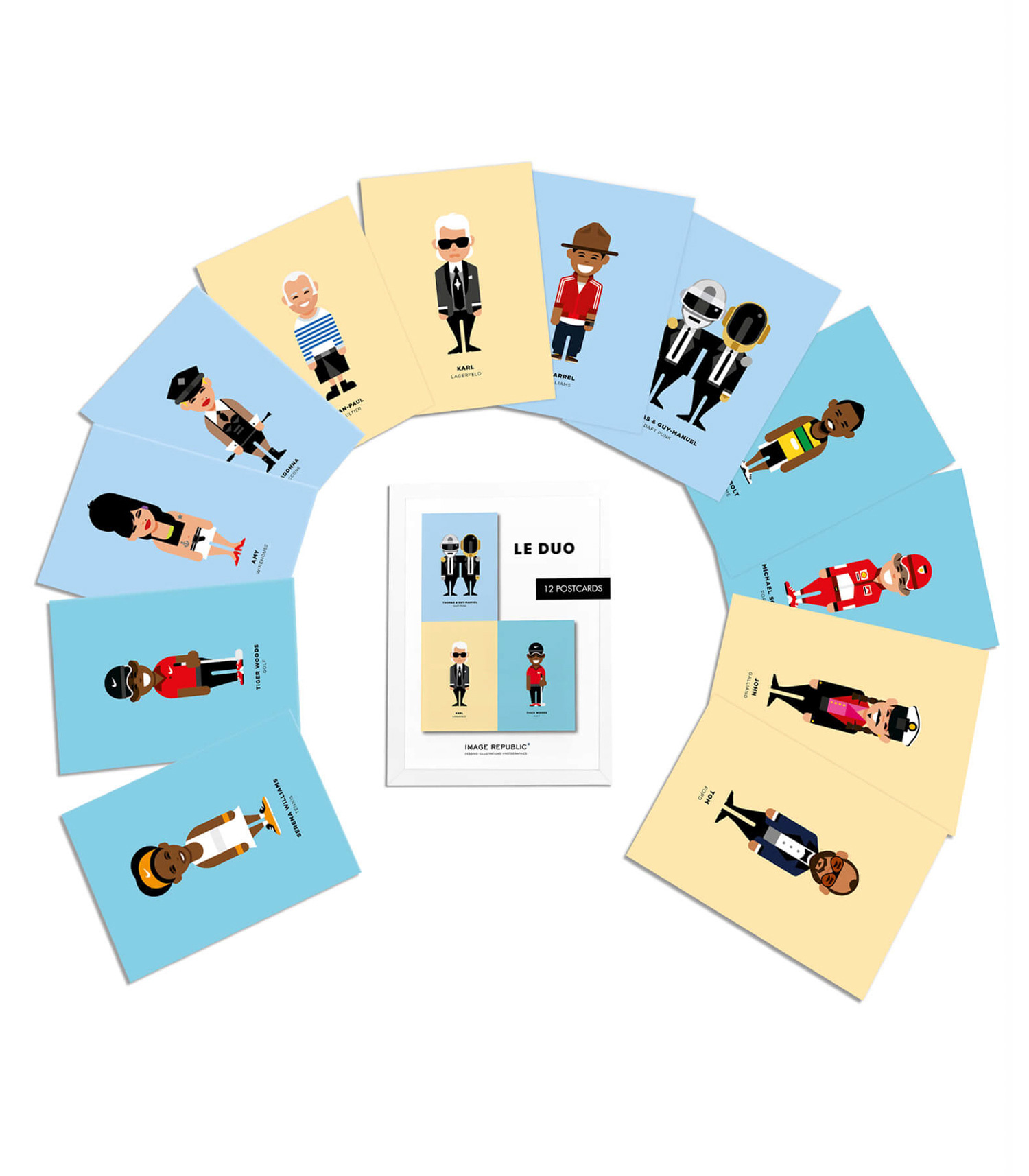 Collection de personnages mythiques signée Image Republic, ce lot de cartes postales — LE DUO 12 postcards rend hommage à des figures cultes de la pop culture. Imaginées par Albéric et Léopoldine de l’atelier parisien LE DUO, ces cartes croquent des artistes tels que Madonna, Karl Lagerfeld ou encore John Galliano.