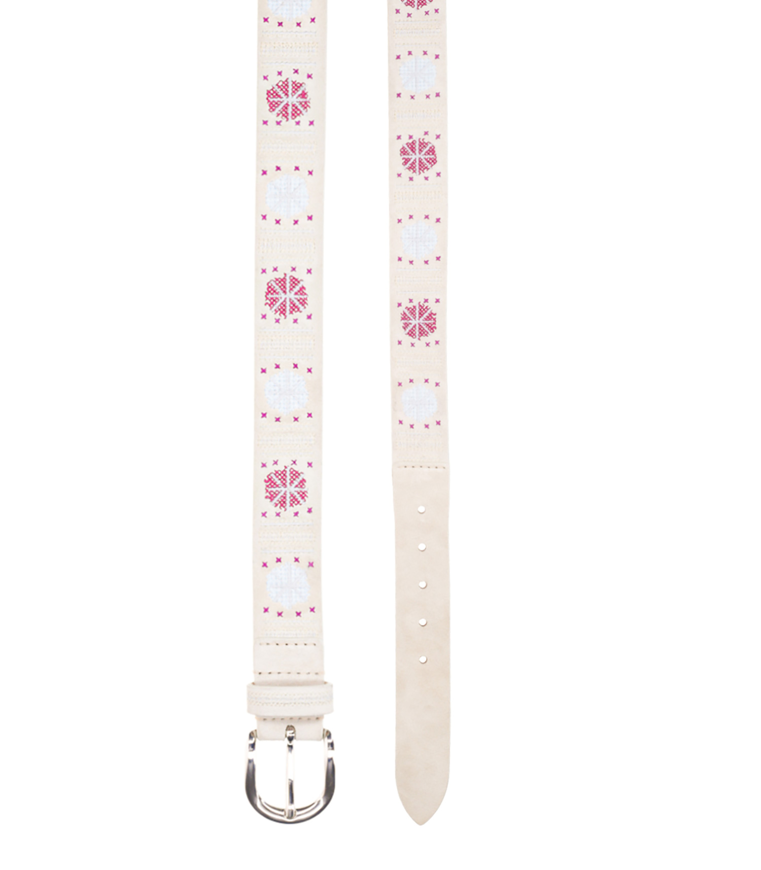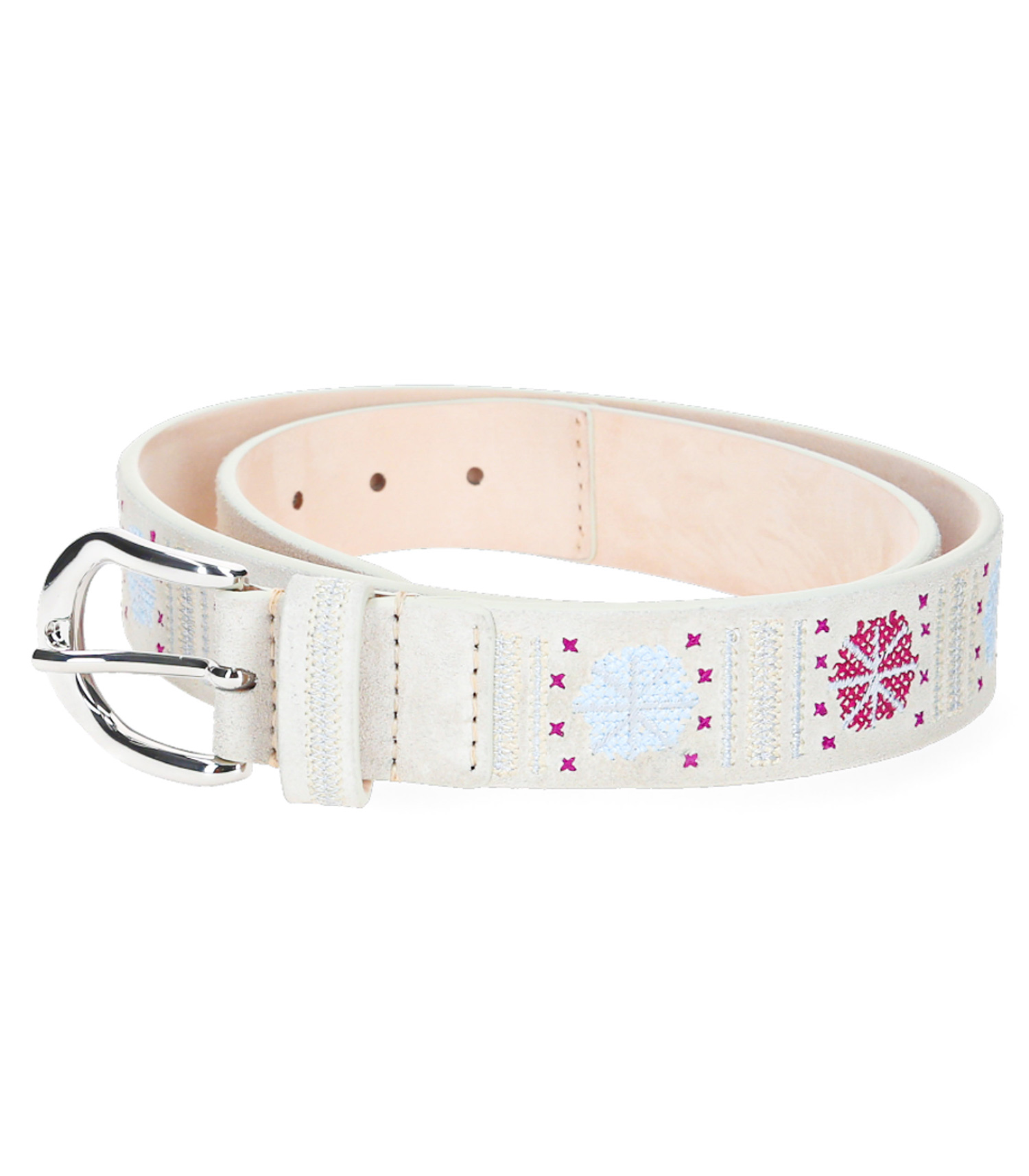 Ceinture Errol isabel Marant, en cuir suédé ivoire et broderies de couleur rose et bleu glacier, identiques aux tonalités très girly et printanières de la collections SS22 de la créatrice. Parfaite pour ponctuer un look de printemps.