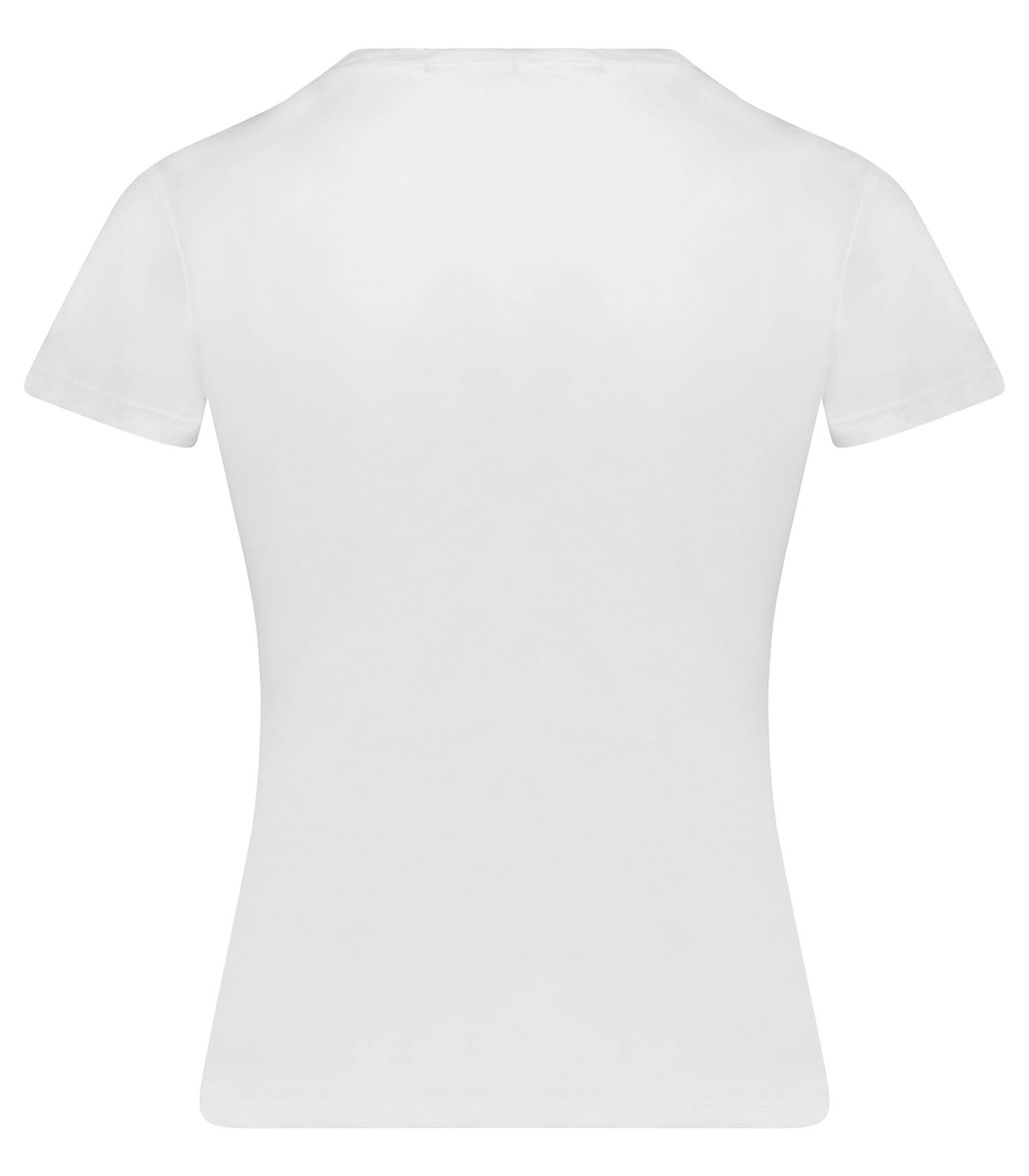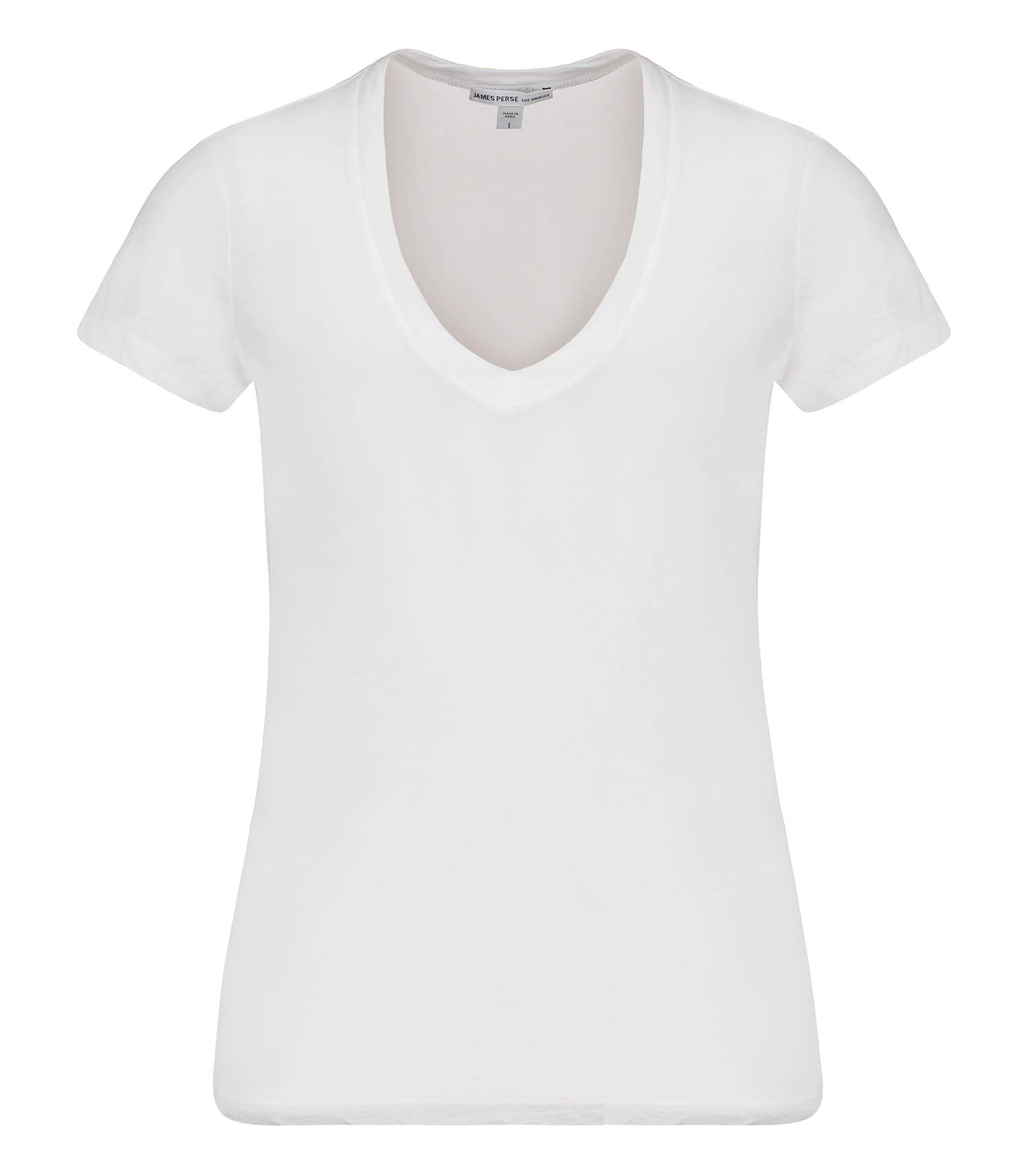Tee-shirt Casual Reverse Binding White signé James Perse. Fabriqué dans un 100% coton flammé classique, il est conçu sur l'envers du tissu pour plus de texture. Ce modèle est ajusté au corps avec un col en V bordé et un ourlet inférieur droit. Teint en pièce avec des assouplissants supplémentaires pour une sensation de douceur. De couleur blanche intemporelle, il se place en véritable basique du dressing féminin, à porter sous des mailles ou une chemise ouverte.