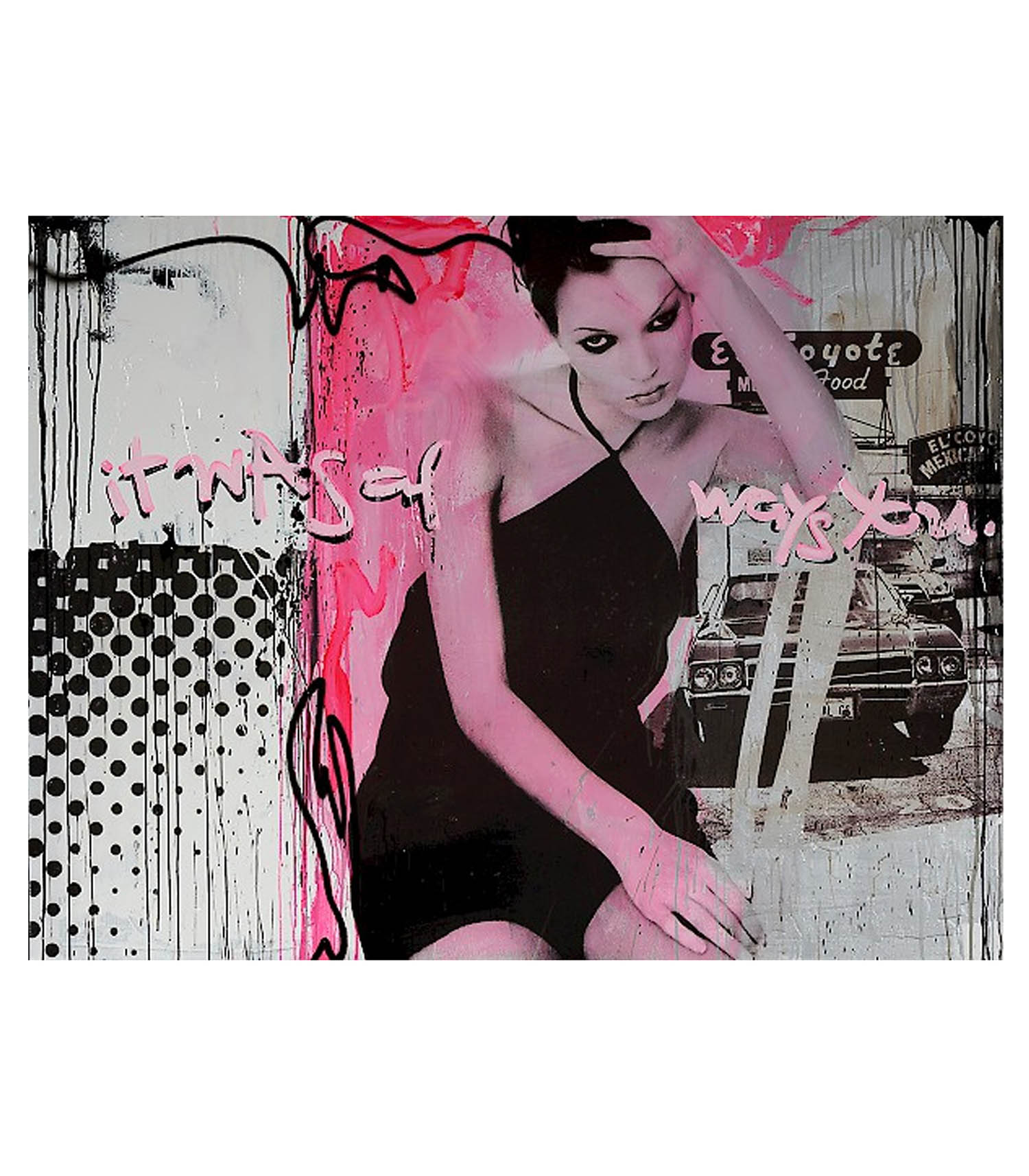 Tableau Jörg Döring "Always You" (2019) composé d'une photographie de Kate Moss retravaillée en collage & peinture. Une pièce graphique avec son accumulation de textures, photographies et texte "It was always you" ("Ca a toujours été toi").