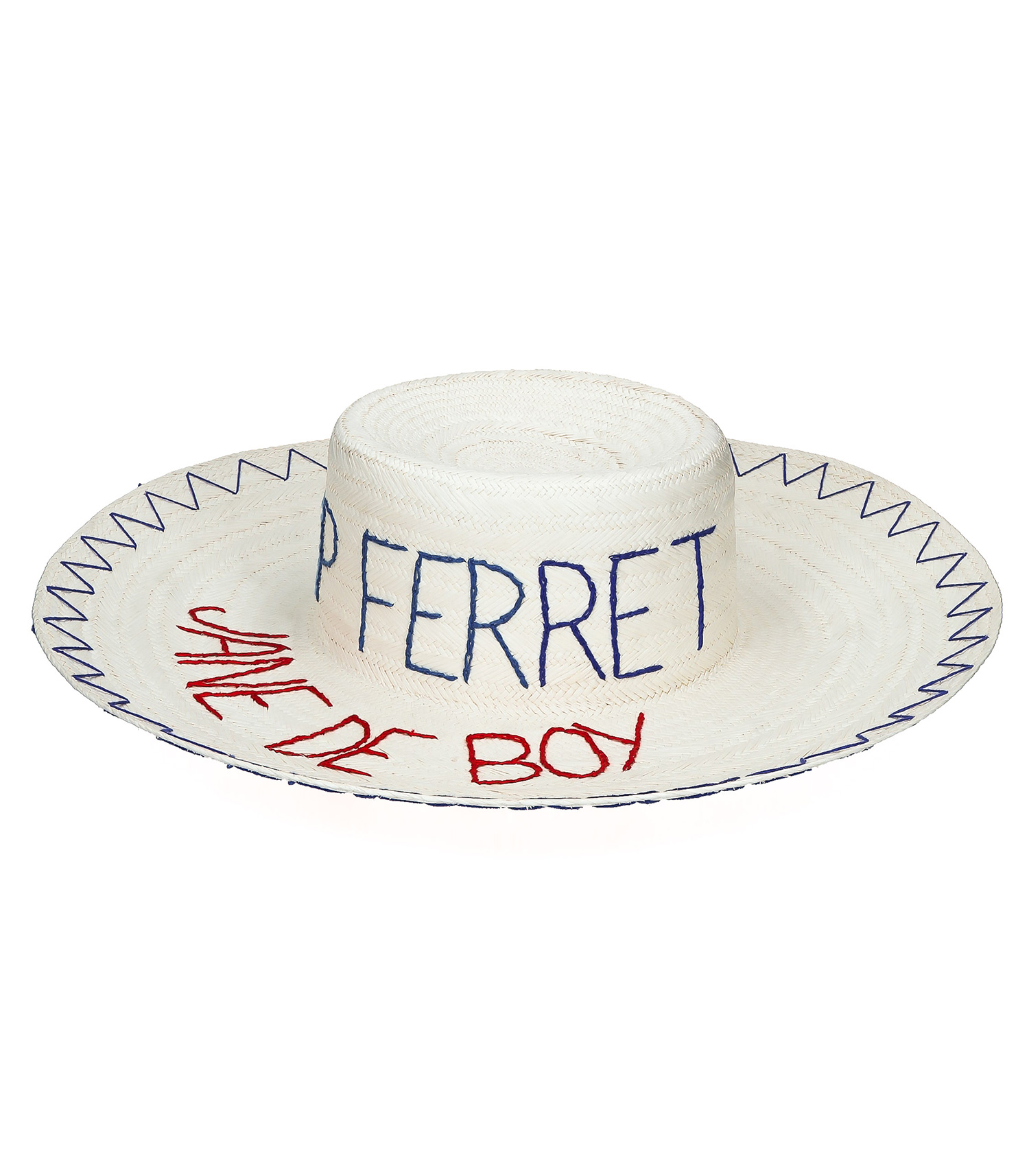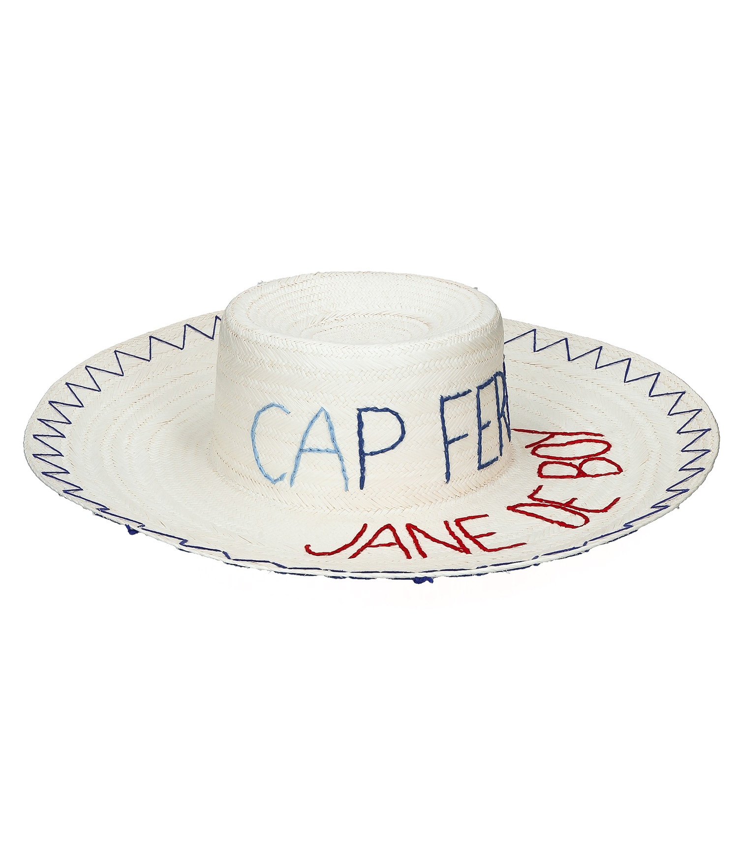 Chapeau de la marque Kilometre Paris, conçu en collaboration avec Jane de Boy, personnalisé d'une broderie "Cap Ferret" bleue sur le haut, "Jane de Boy" rouge sur la partie plate et d'une bordure en zig zag sur le bord à l'extérieur et à l'intérieur.