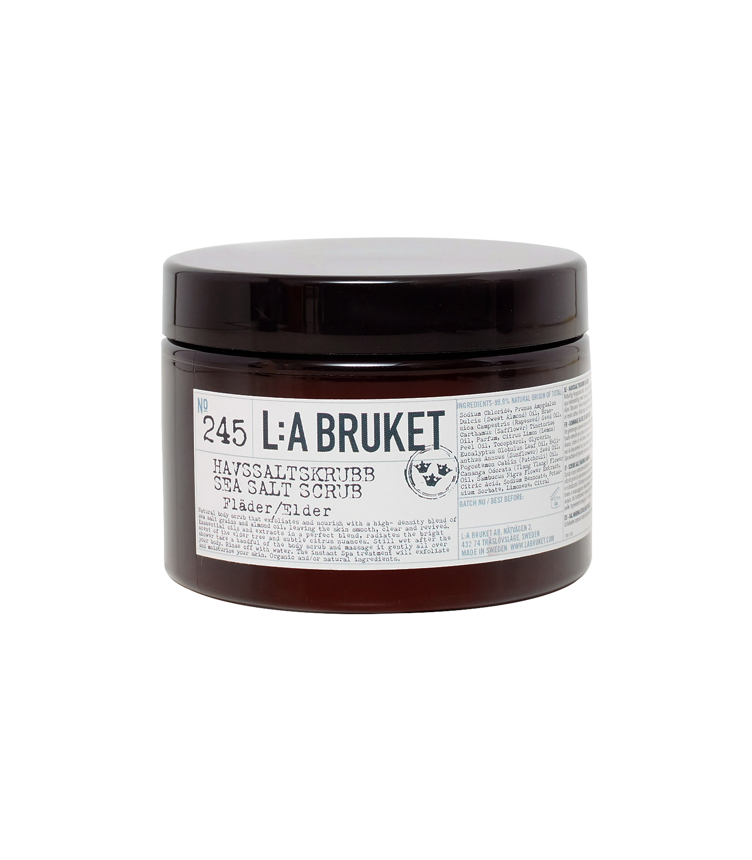 Gommage exfoliant n°245 au sel marin et extrait de fleur de sureau L:a Bruket, formulé à partir d'ingrédients naturels et biologiques, conçu pour hydrater et adoucir la peau, tout en améliorant la circulation. Les huiles végétales et huiles essentielles contenues dans sa formule procurent des propriétés apaisantes et adoucissantes, et favorise l'élimination de peaux mortes.