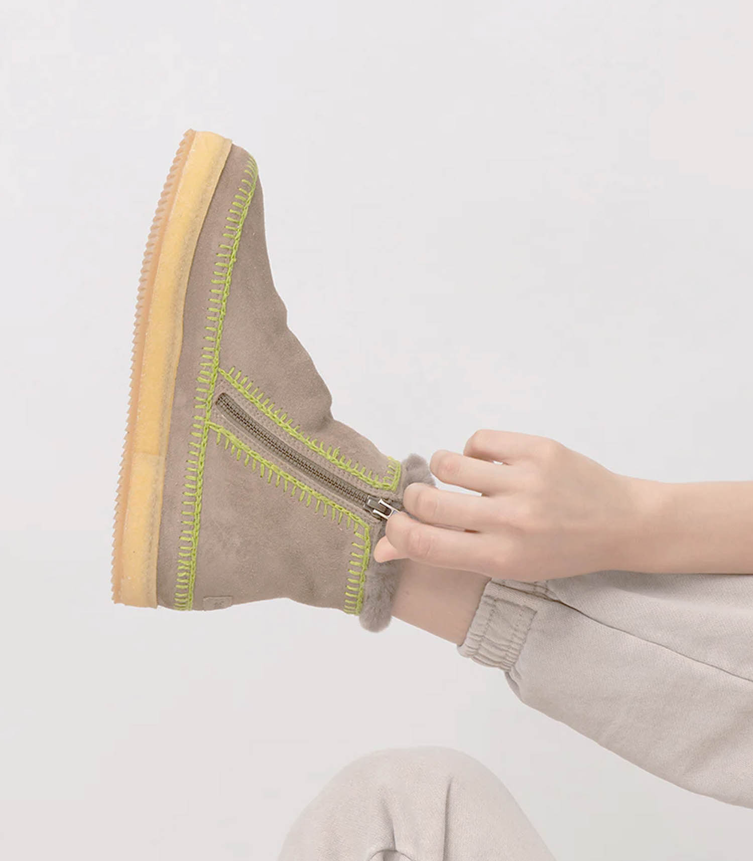 Boots Setsu Crochet Otter Suede Lime signées Laidback London. Craquez pour ces boots au coloris camel, à la fois tendances et polyvalentes. Elles sont rehaussées par une surpiqûre en crochet jaune qui ajoute une touche subtile. Idéales pour vos tenues d'automne, elles combinent sobriété et intemporalité pour un style impeccable en toutes occasions.