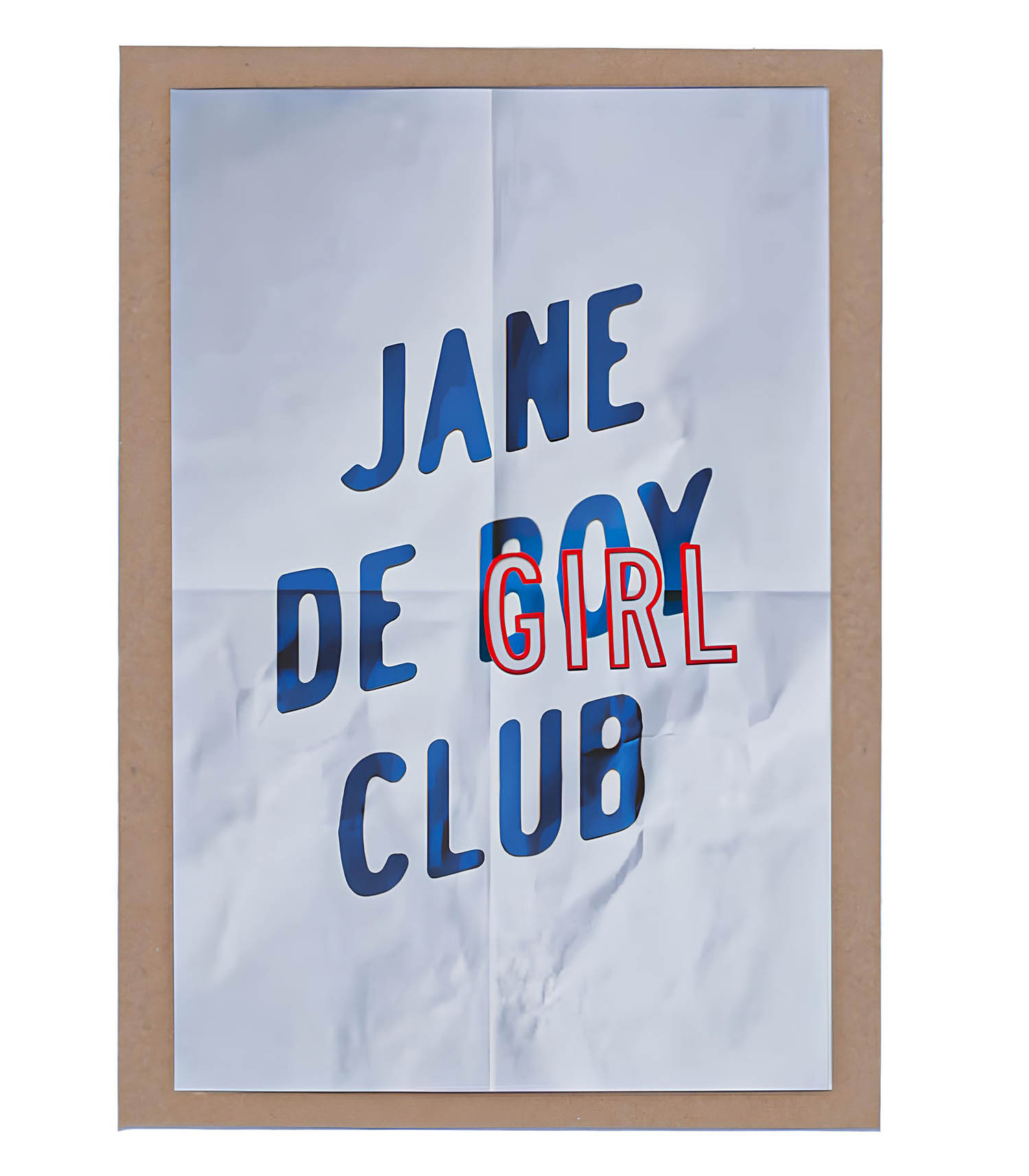 Carte de voeux Jane de Girl Club Bleu et Rouge issue d'une collab' exclusive entre Jane de Boy & Les Bonnes Soeurs. Le fameux mantra "Jane de Boy Club" est revisité pour l'occasion avec "Girl". Idéale pour accrochez chez soi et afficher son appartenance au gang des Janettes, ou pour écrire un petit mot personnalisé à l'un de ses proches.