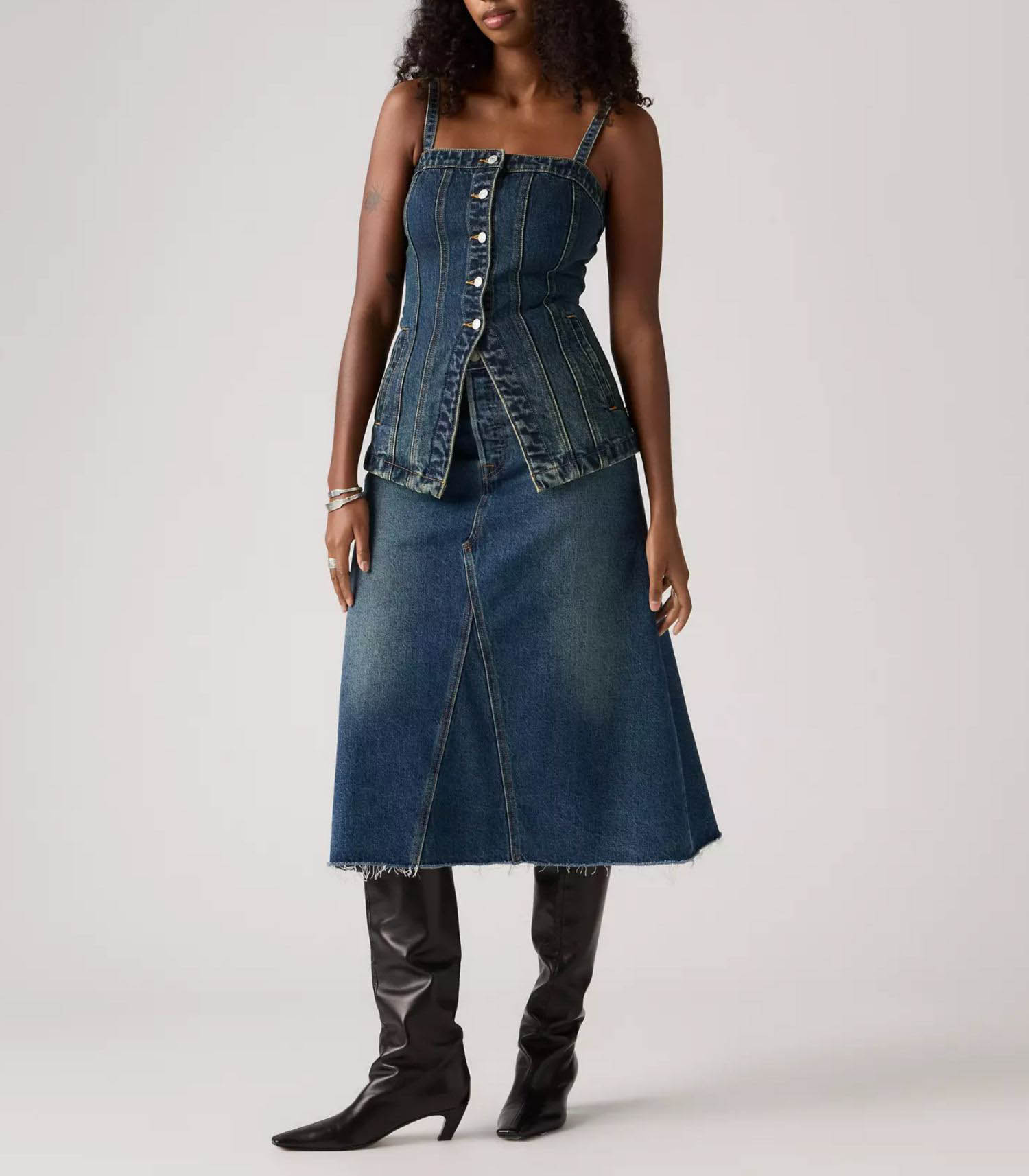 Adoptez une alternative stylée à votre jean quotidien avec la jupe Decon. Confectionnée en denim rigide, elle affiche une coupe en A mi-longue qui flatte la silhouette, soulignée par une taille haute décontractée. Ses finitions déstructurées lui apportent une touche moderne et subtilement rebelle. Une pièce facile à associer, à la fois féminine et pleine de caractère.