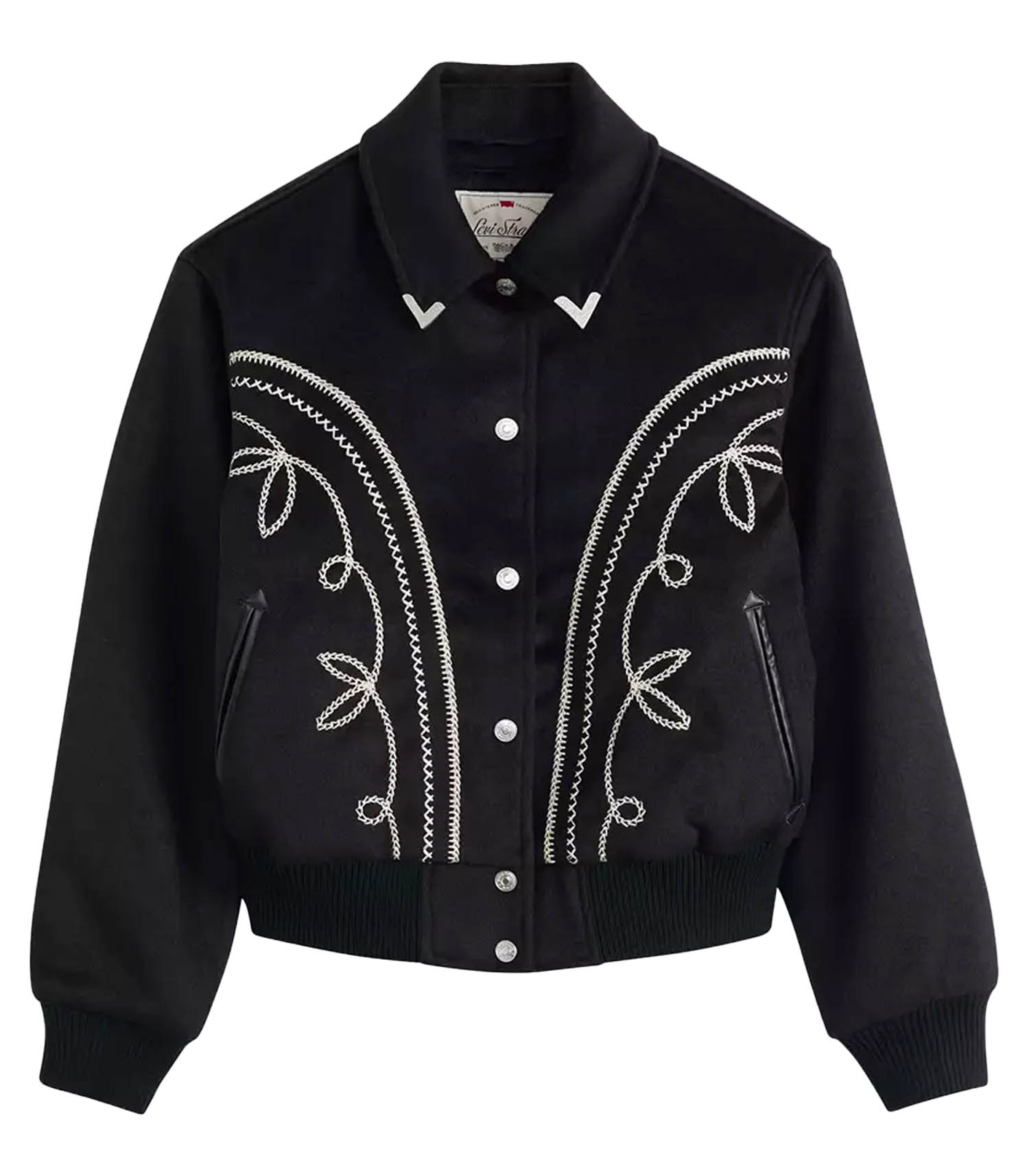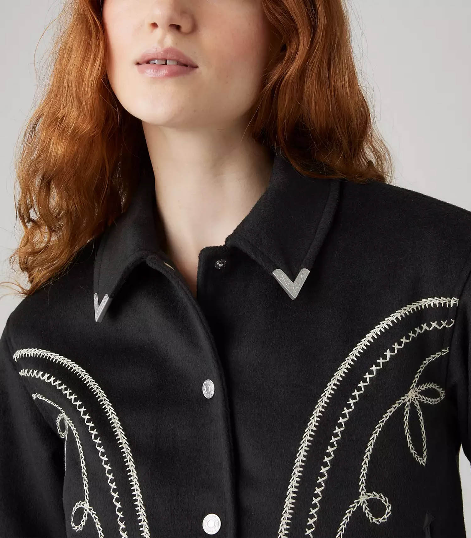 La tendance Western arrive en ville. Cette veste Lennox Rodeo de style Western a une patte de boutonnage classique devant, une coupe standard et des détails brodés. elle a aussi un col à pointe avec ornement en métal pour un look encore plus affirmé.