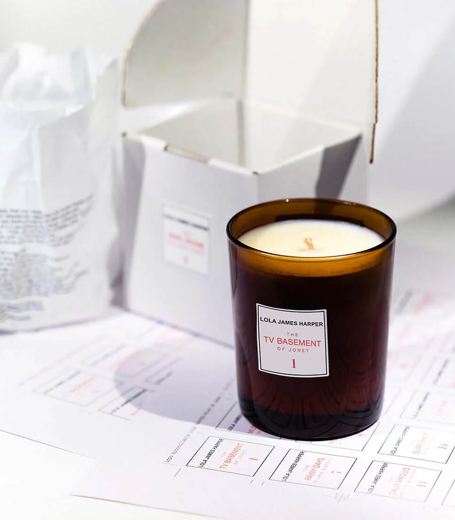 Bougie #1 The TV Basement 190g de la marque Lola James Harper, fabriquée en France à partir de cire végétale et d'huiles essentielles rares. Lola James Harper créé des fragrances conçues pour évoquer un lieu et son atmosphère précise.