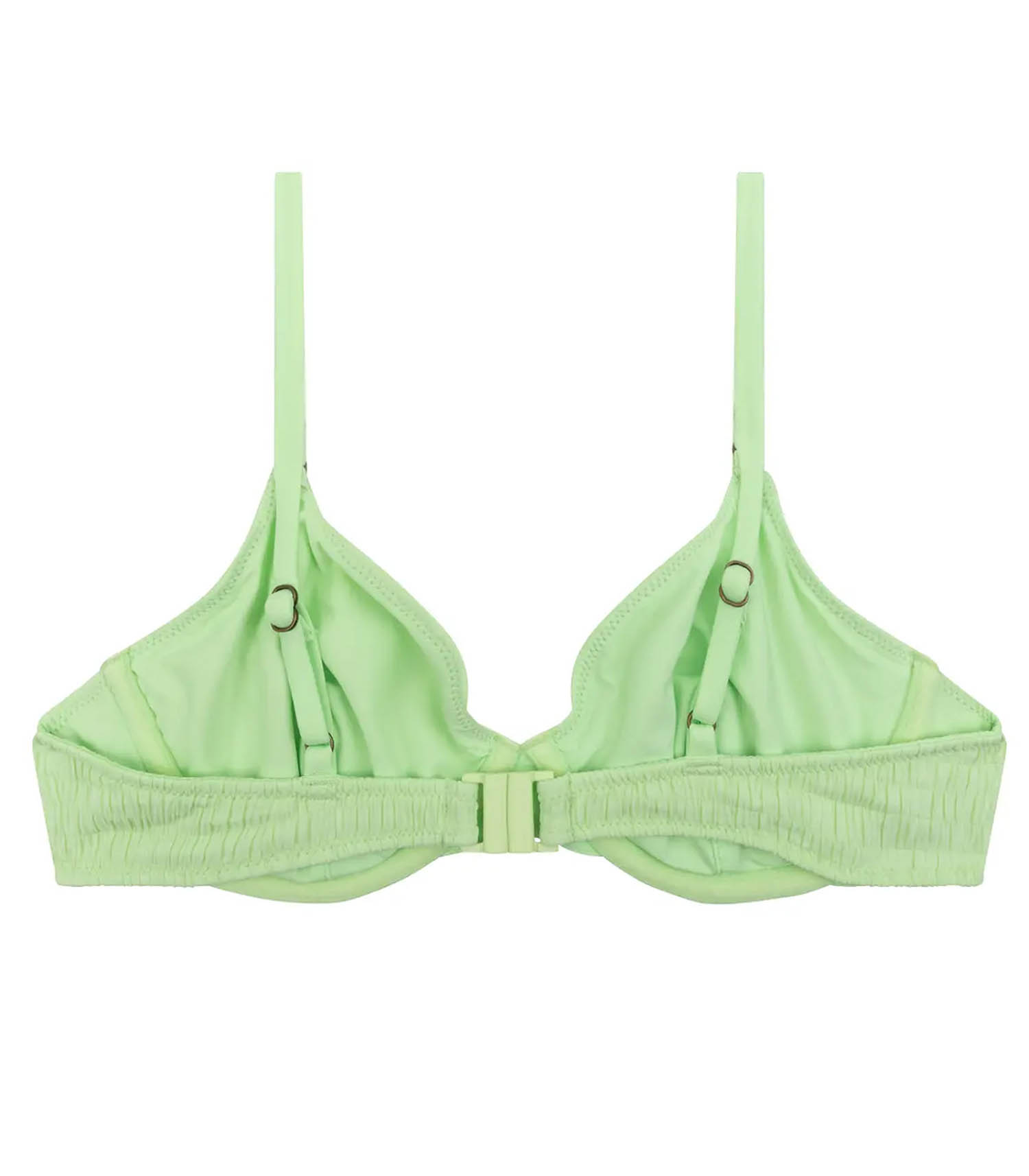 Haut de Bikini Romeo Green de la marque Love Stories, un haut de bikini non rembourré, avec anneaux, de couleur verte confectionnée en tissu doux extensible avec une finition froncée avec surpîqûres.