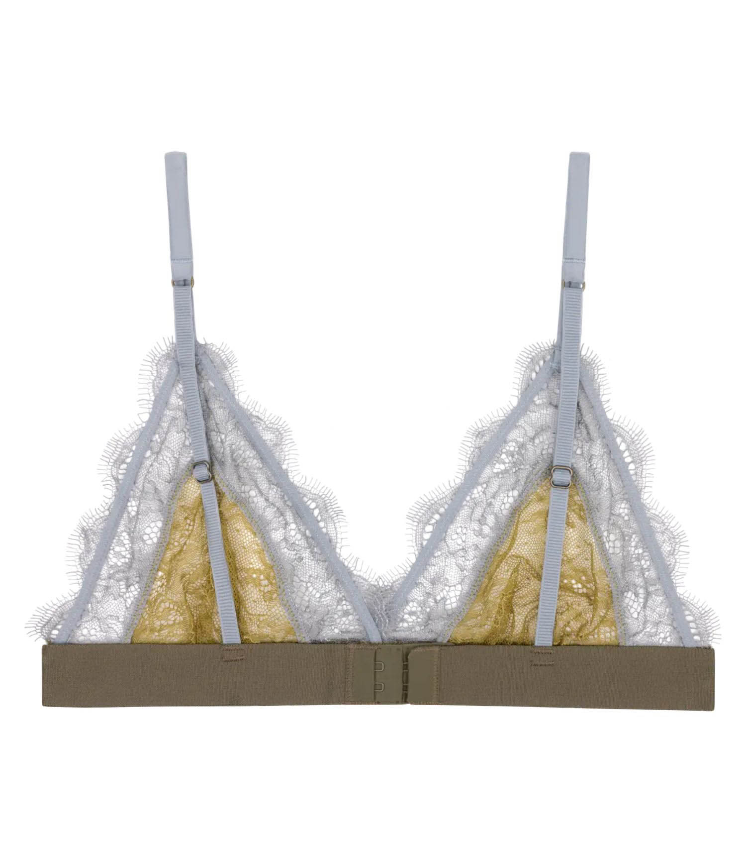 Soutien Gorge Love Lace green de la marque Love Stories. La bralette Love Lace se distingue par sa silhouette audacieuse et son esprit décalé. Sa dentelle fine, légère et semi-transparente, se mêle harmonieusement à des panneaux de satin vert olive, créant un contraste saisissant. Les bretelles contrastées en rose fluo ajoutent une touche de modernité et d'énergie, tandis que l'élastique sous-poitrine, sobre et épuré, assure un maintien léger tout en soulignant la taille. Idéale pour celles qui souhaitent allier confort et originalité dans leur lingerie.