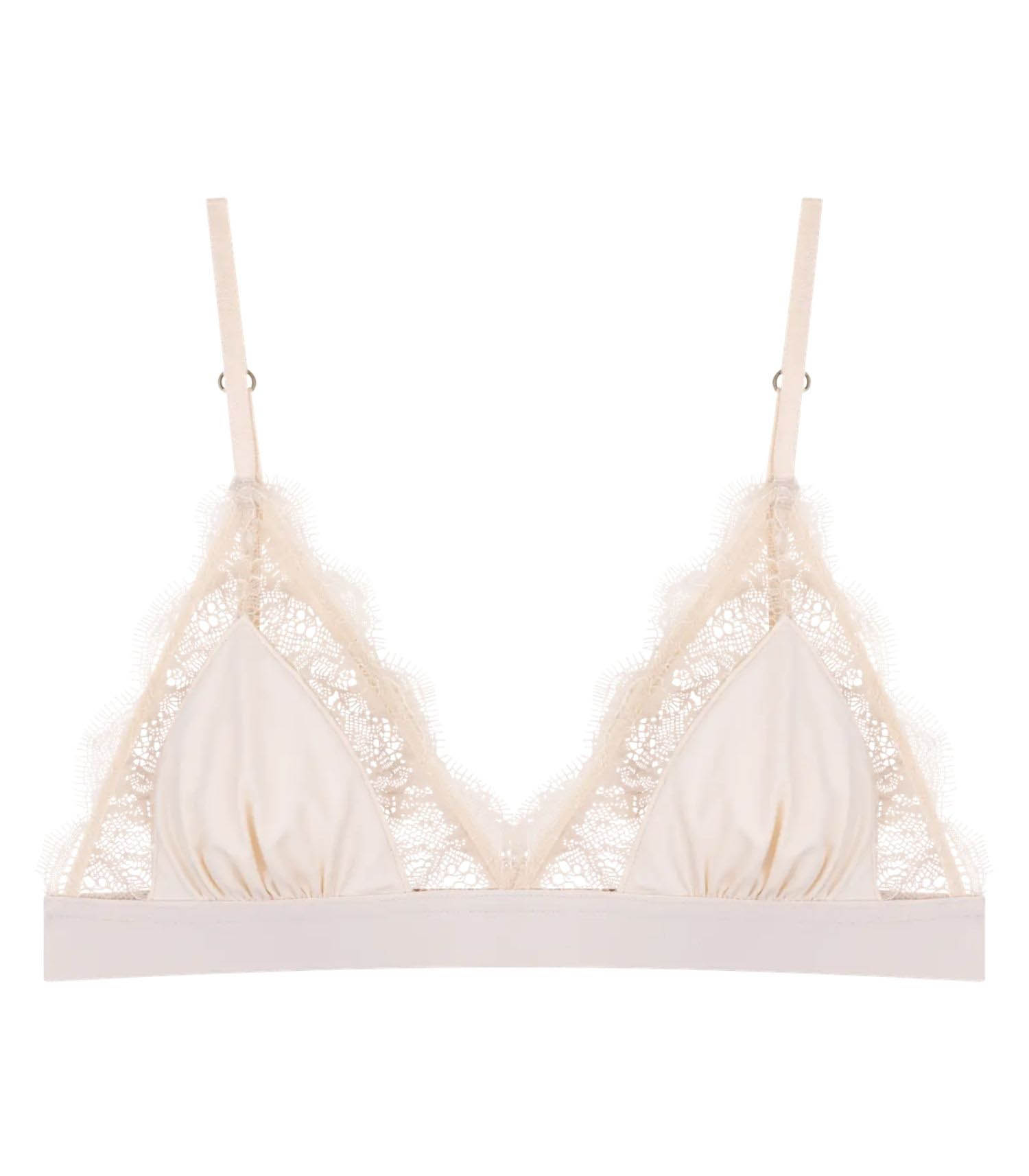 Soutien-gorge Love Lace Off White de la marque Love Stories. Confectionnée dans un tissu doux au fini subtilement brillant, cette bralette dévoile une allure délicate et raffinée. Sa coupe triangle sans rembourrage offre un maintien naturel et moyen, tout en garantissant un ajustement sûr et confortable. Un essentiel de lingerie qui conjugue élégance et simplicité.