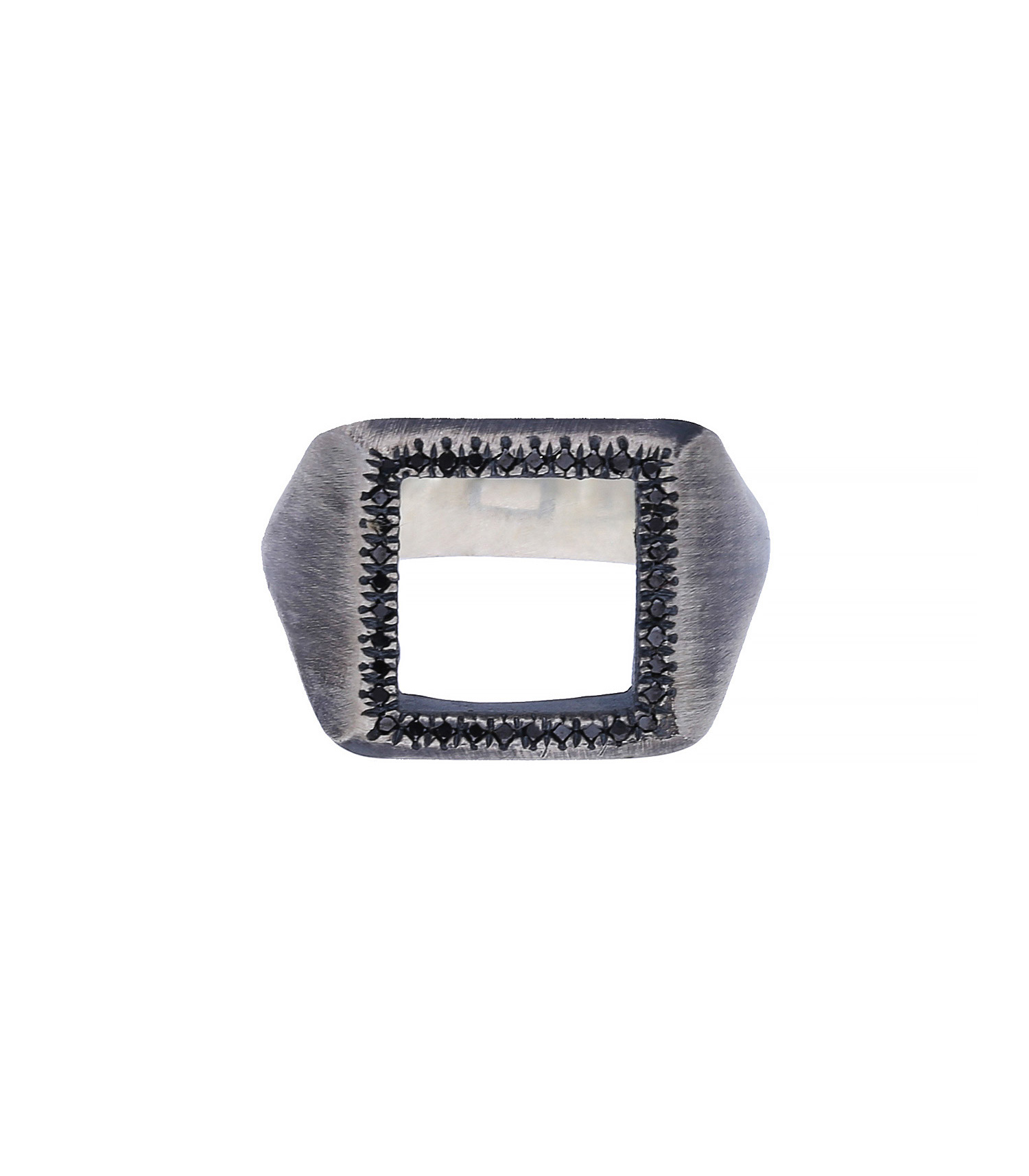The Zenith Diamond Ring est une bague alliant matériaux raffinés et look brut, dessinée par M.Cohen. L'argent 925 à effet oxydé est une signature du créateur californien. Cette bague unisexe se distingue par l'incrustation de diamants noirs et par sa forme carrée laissant apparaître la peau.