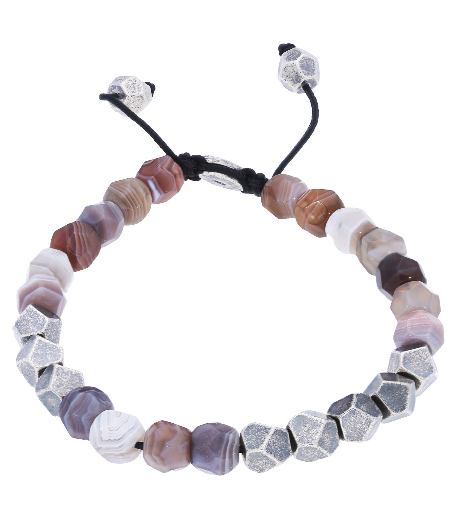 Bracelet Deca 10 M.Cohen composé de perles géométriques en argent et de perles en agate du Botswana. L'agate du Botswana est une perle à la particularité d'avoir des stries et de se décliner dans un camaïeu de rouge/brun. Monté sur un cordon textile noir, c'est une pièce originale qui se démarquera à votre poignet.