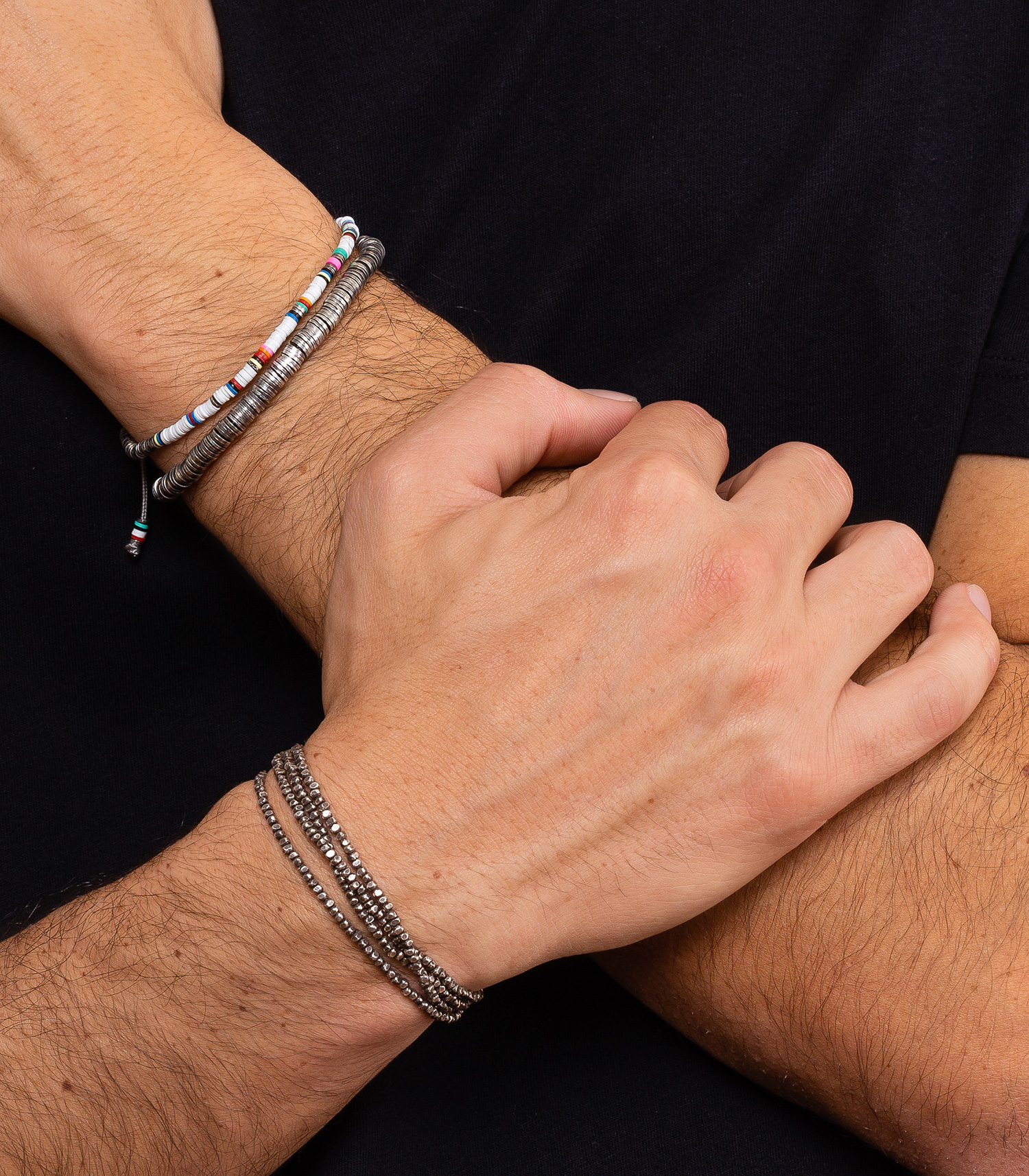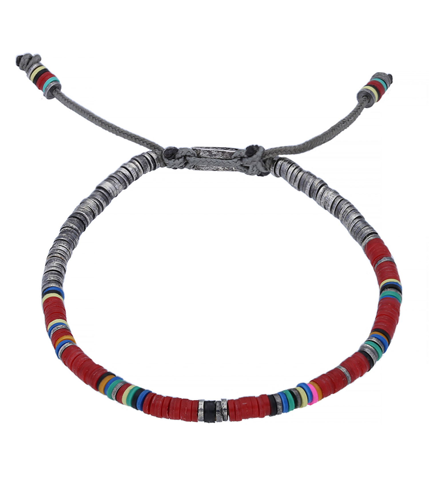 Décliné en 7 coloris, le bracelet Mini en perles africaines et argent est l'un des bijoux emblématiques de la collection M.Cohen. Il se caractérise par une succession de traditionnelles perles africaines en forme de disques de couleur et de disques en argent oxydés, caractéristiques de la maison. Chaque bracelet est ajustable grâce à son système de fermeture à doubles cordons.
