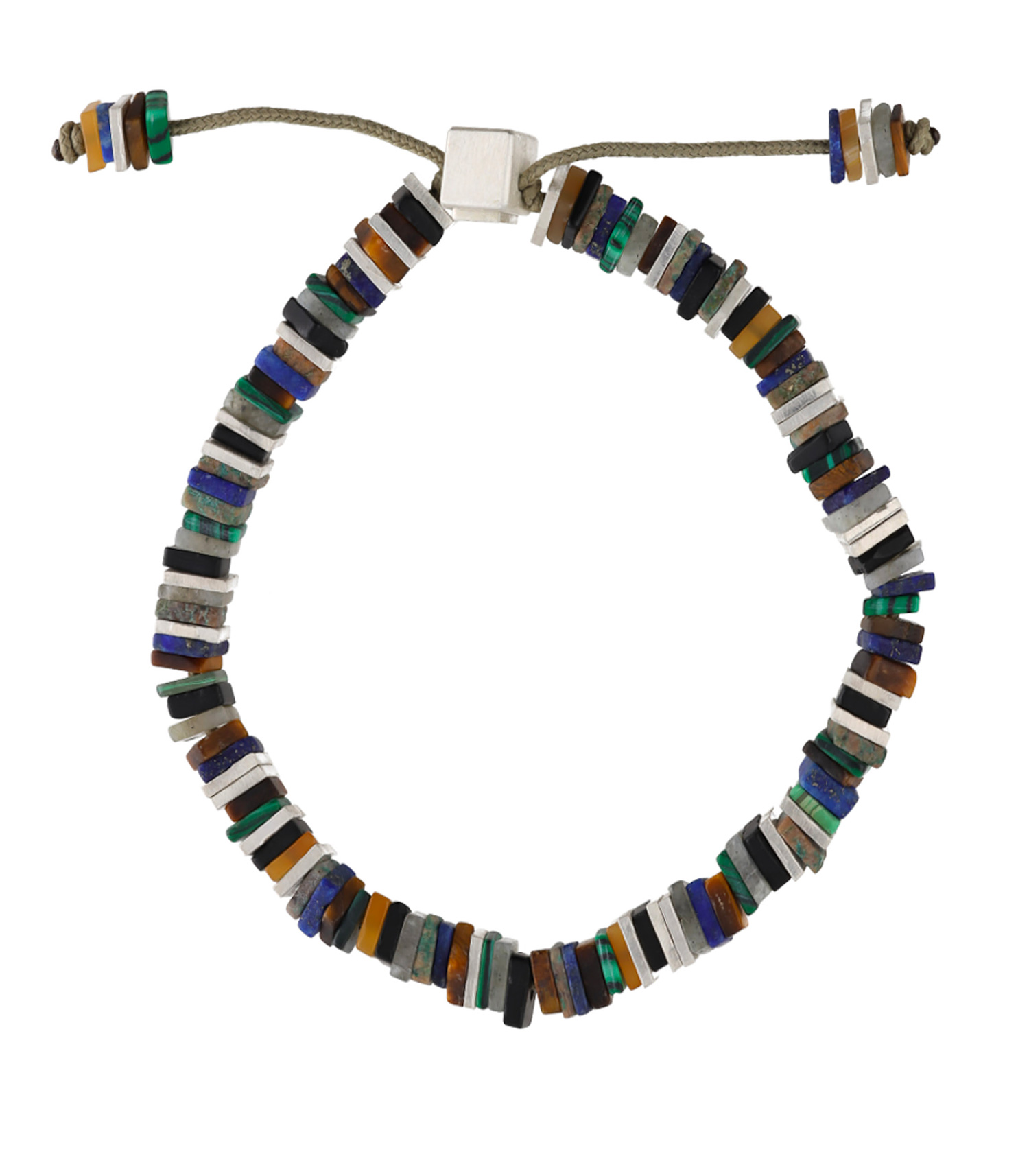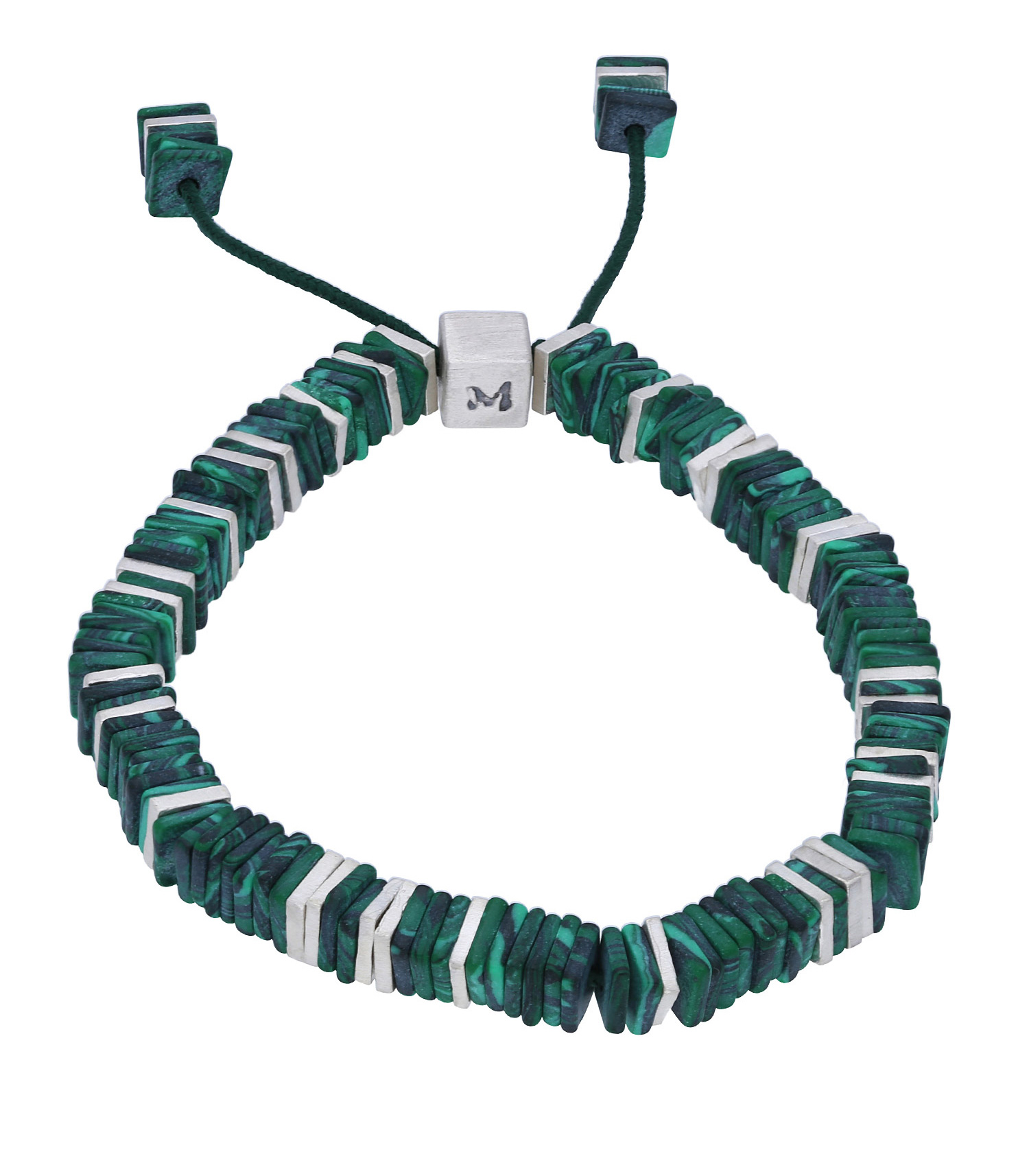 Imaginé par le créateur israélien Maor Cohen, ce bracelet Razze Square à perles carrées M.Cohen est un bijou à fort caractère. Il se distingue par une succession de perles de pierres et d'argent sterling 925. Décliné en 4 coloris, il se noue au poignet à l'aide d'un cordon. Chaque bracelet est ajustable grâce à son système de fermeture à doubles cordons.