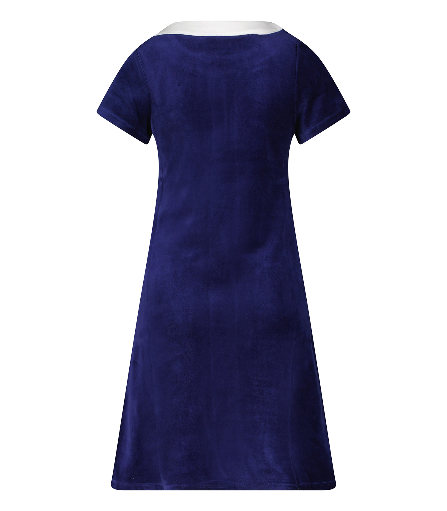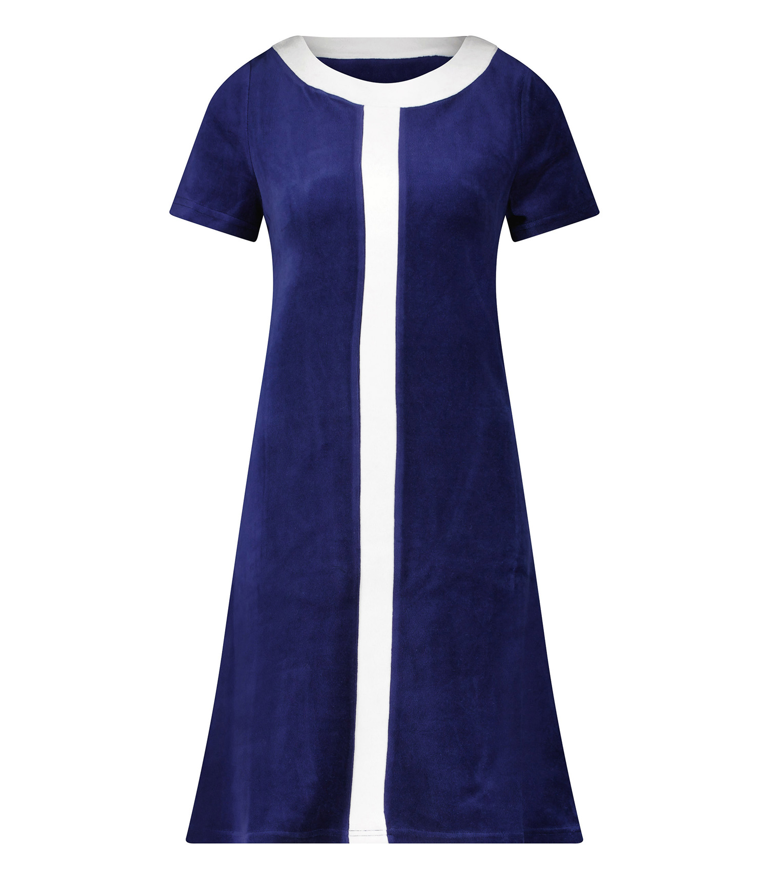 Ma Petite Plage s'inspire de l'iconique Diana Riggs et crée la robe Diana en velours éponge. Son coloris bleu nuit est traversé par une large bande blanche au milieu de la robe jusqu'au col.