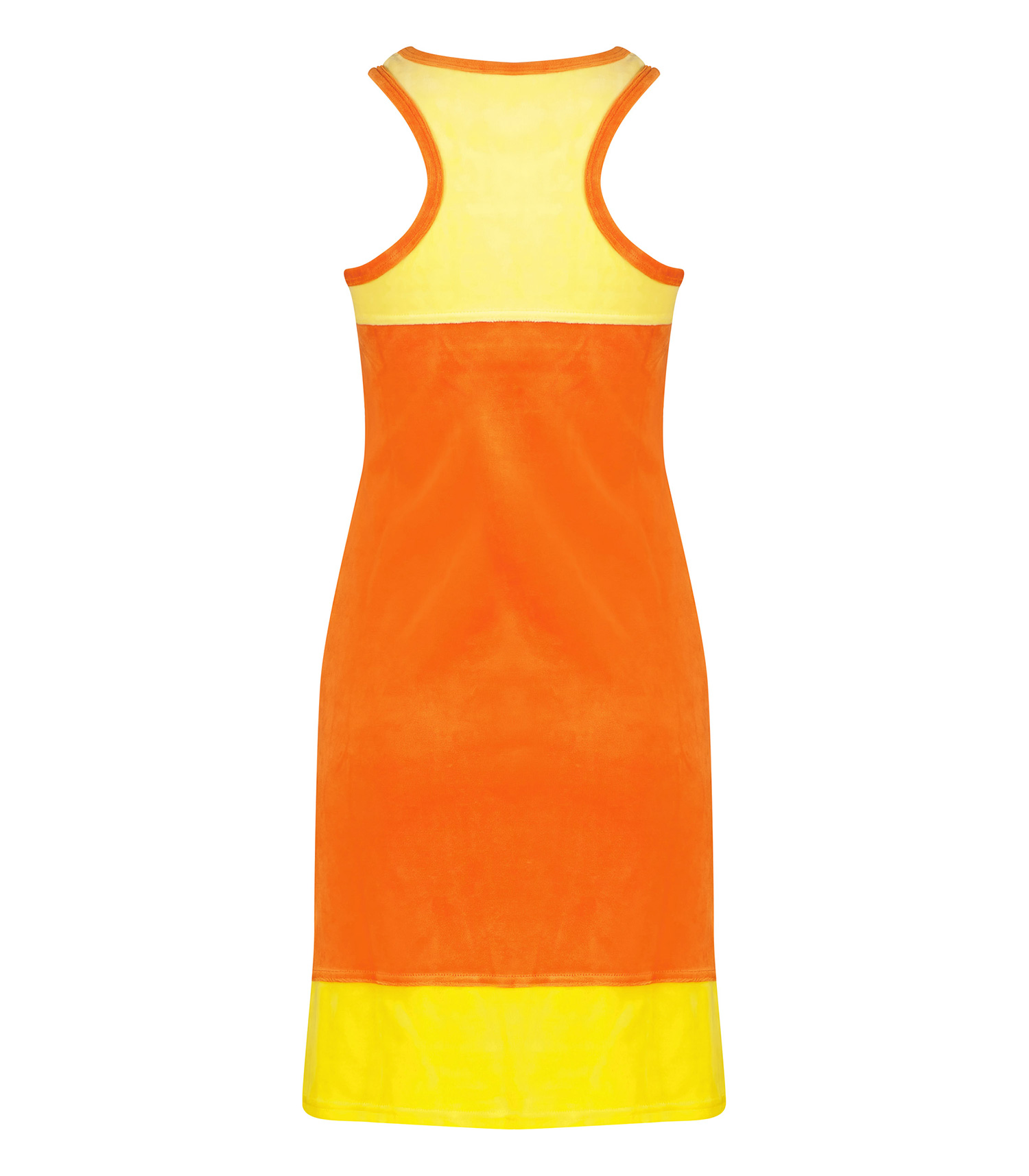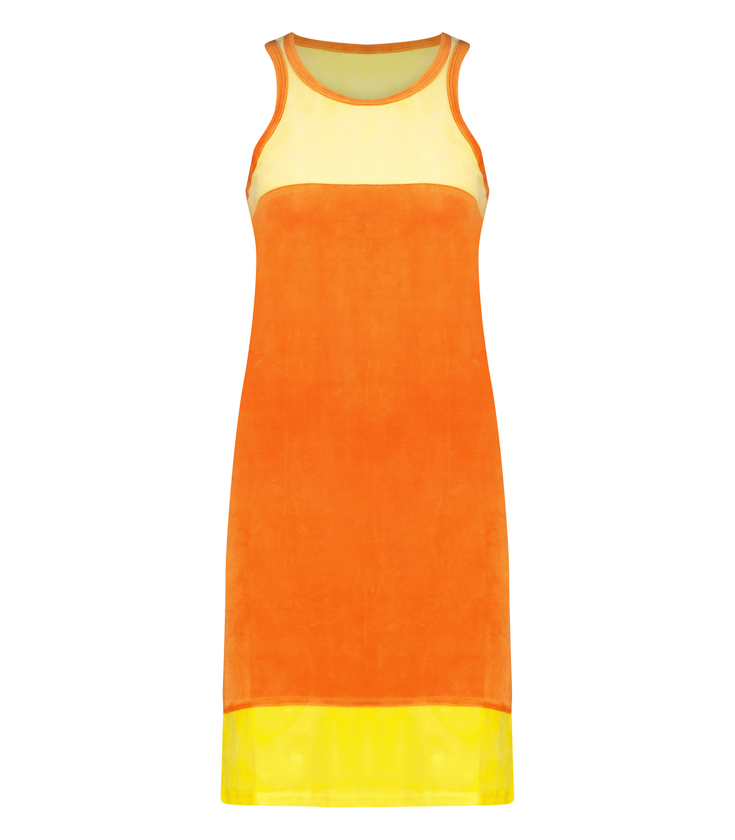 Robe Haydee Jaune & Orange de la marque Ma Petite Plage. Ce modèle comprend un empiècement jaune sur le haut et le bas de la robe majoritairement orange sur la partie centrale, le col et les emmanchures. Coupe droite sans manches, esprit 60s.