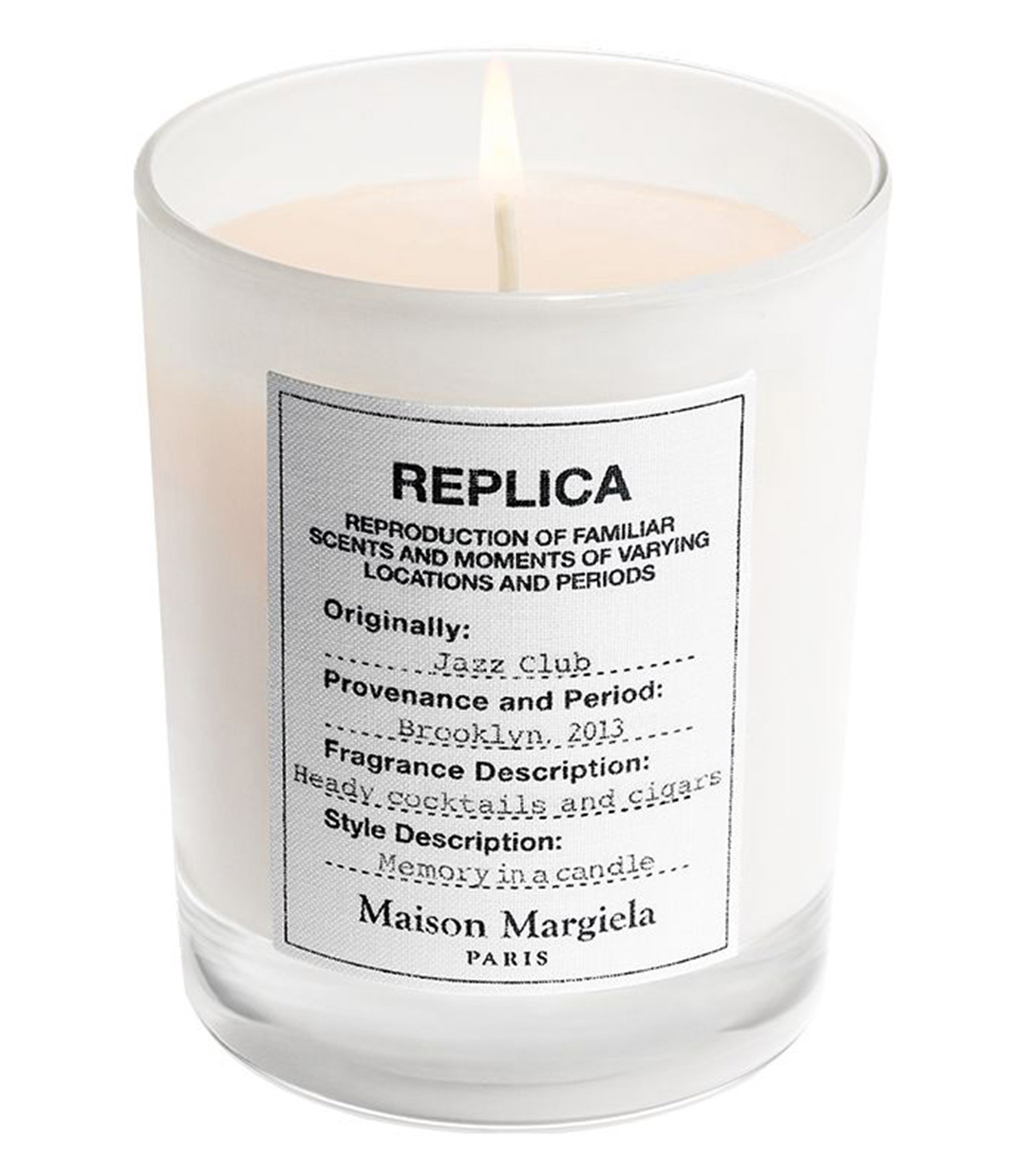 Bougie parfumée Replica Jazz Club de la Maison Margiela, conçue pour évoquer une ambiance cosy et jazzy, comme un bon verre servi sur un fond de musique jazz, confortablement assis dans un fauteuil matelassé en cuir, sous une lumière tamisée. Une odeur qui rappelle les cocktails enivrants et le cigare, avec des notes épicées et riches.