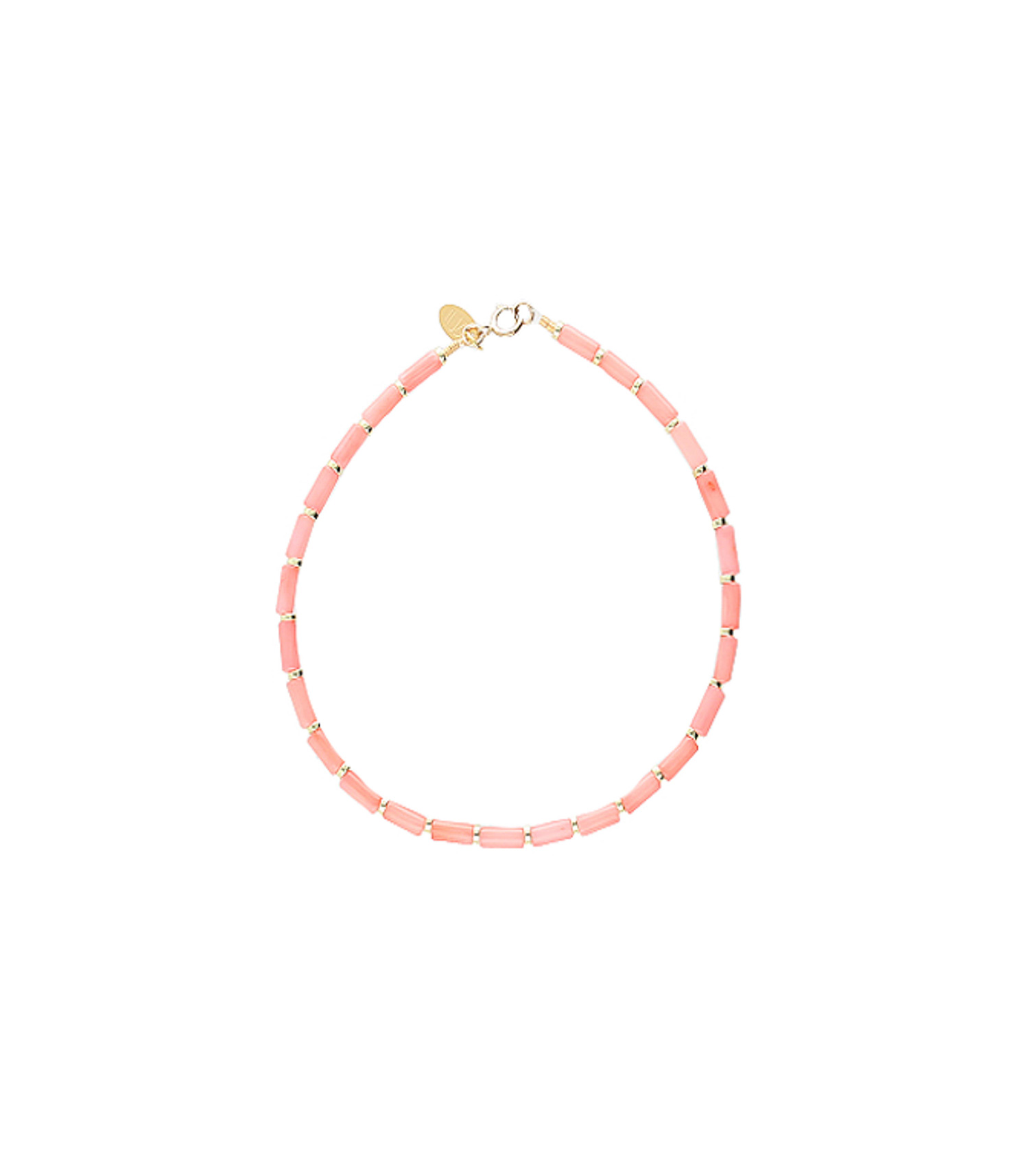 Bracelet de cheville Cécile signé Maison Mönik. Estival et féminin, ce modèle est composé de perles en bambou de mer et de quelques perles en hématite, ainsi que d'un fermoir en plaqué or.