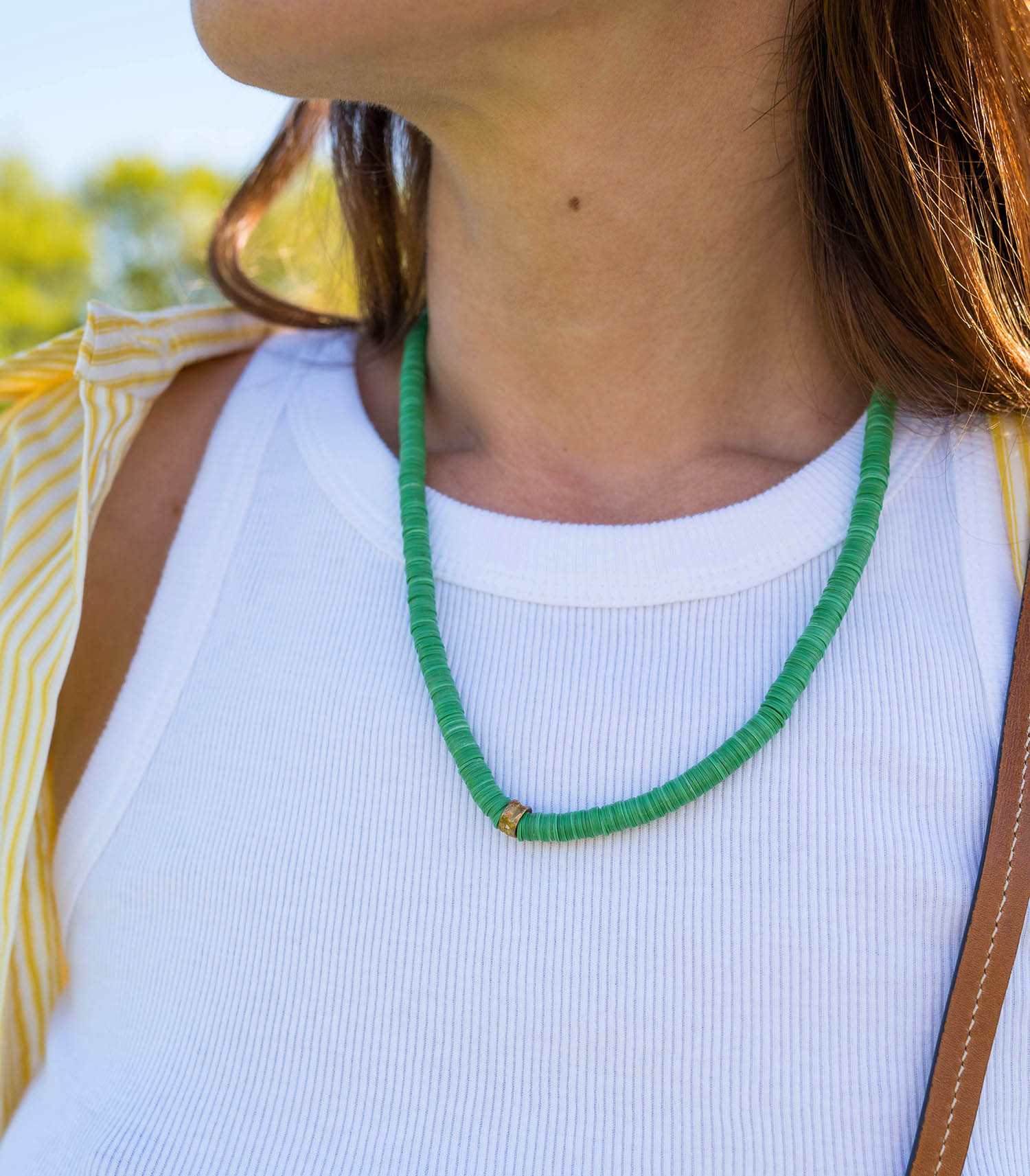 Apportez une touche éthnique à votre décolleté avec le modèle Bonni Maison Mönik. Ce collier est réalisé en perles de vinyle recyclé vertes provenant du Ghana et comporte une perle en laiton au centre d'un diamètre de 6 mm.