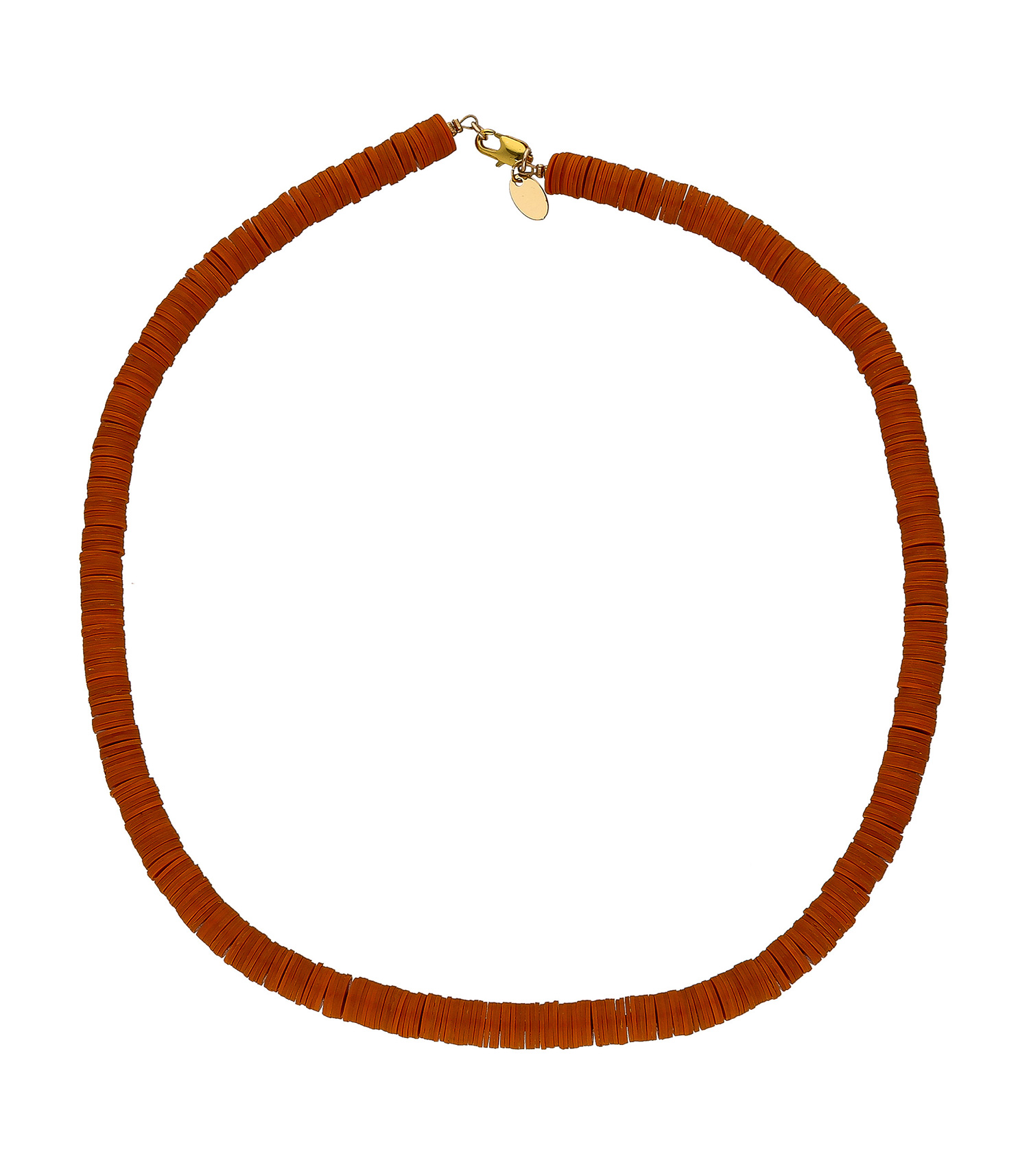Caramel, noir, brun, marine et rose ancien, le collier Solo 6mm imaginé par Maison Mönik Collier se décline dans des coloris intenses et tendance. Monté sur câble semi-rigide de 45 cm, ce bijou se distingue par ses perles en vinyle faites à la main au Ghana.