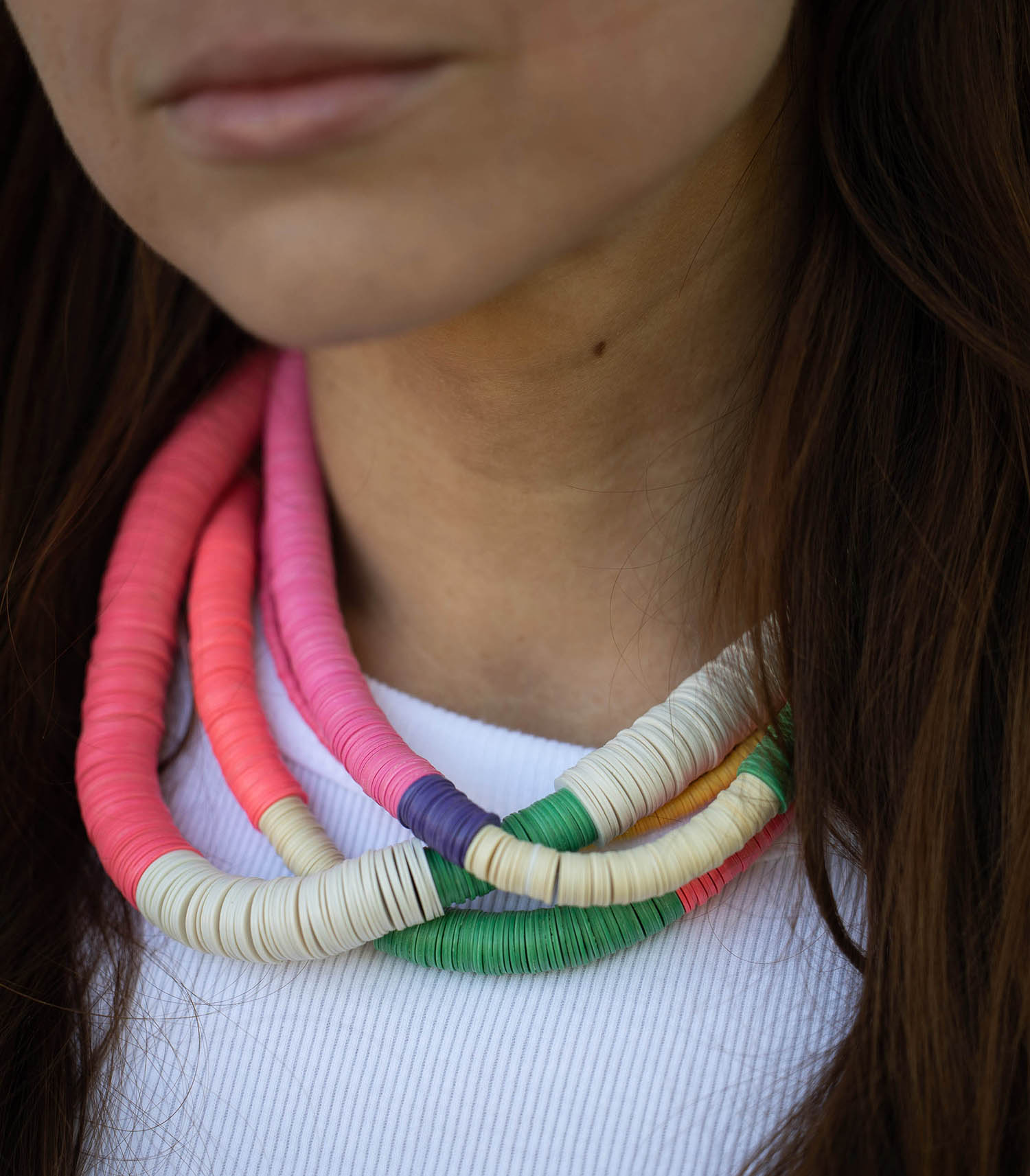 Le collier Tahiti Rose de la marque Maison Mönik se pare de perles roses et vertes en vinyle recyclé ainsi que de quelques perles couleur ivoire. Idéal pour apporter une touche de couleur à votre tour de cou.