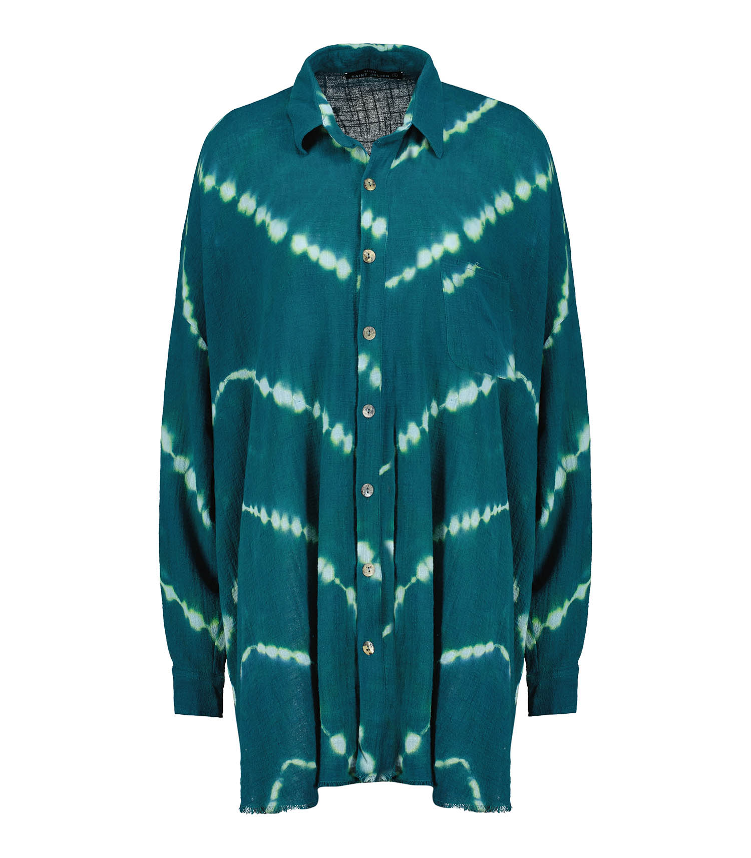 Chemise mi-longue oversize en mousseline de coton vert émeraude, sublimée par un tie & dye artisanal réalisé à la main, rendant chaque pièce unique. Légère et aérienne, sa transparence subtile joue avec la lumière, tandis que ses épaules tombantes et sa finition brute lui donnent une allure libre et contemporaine. Les boutons en coquillage naturel signent le look d’une touche précieuse et organique.