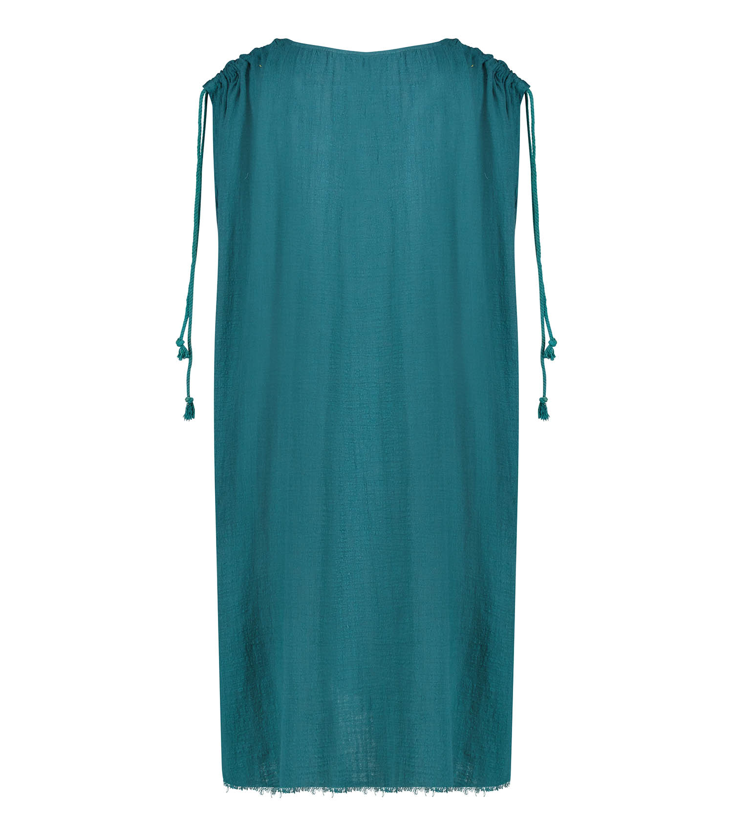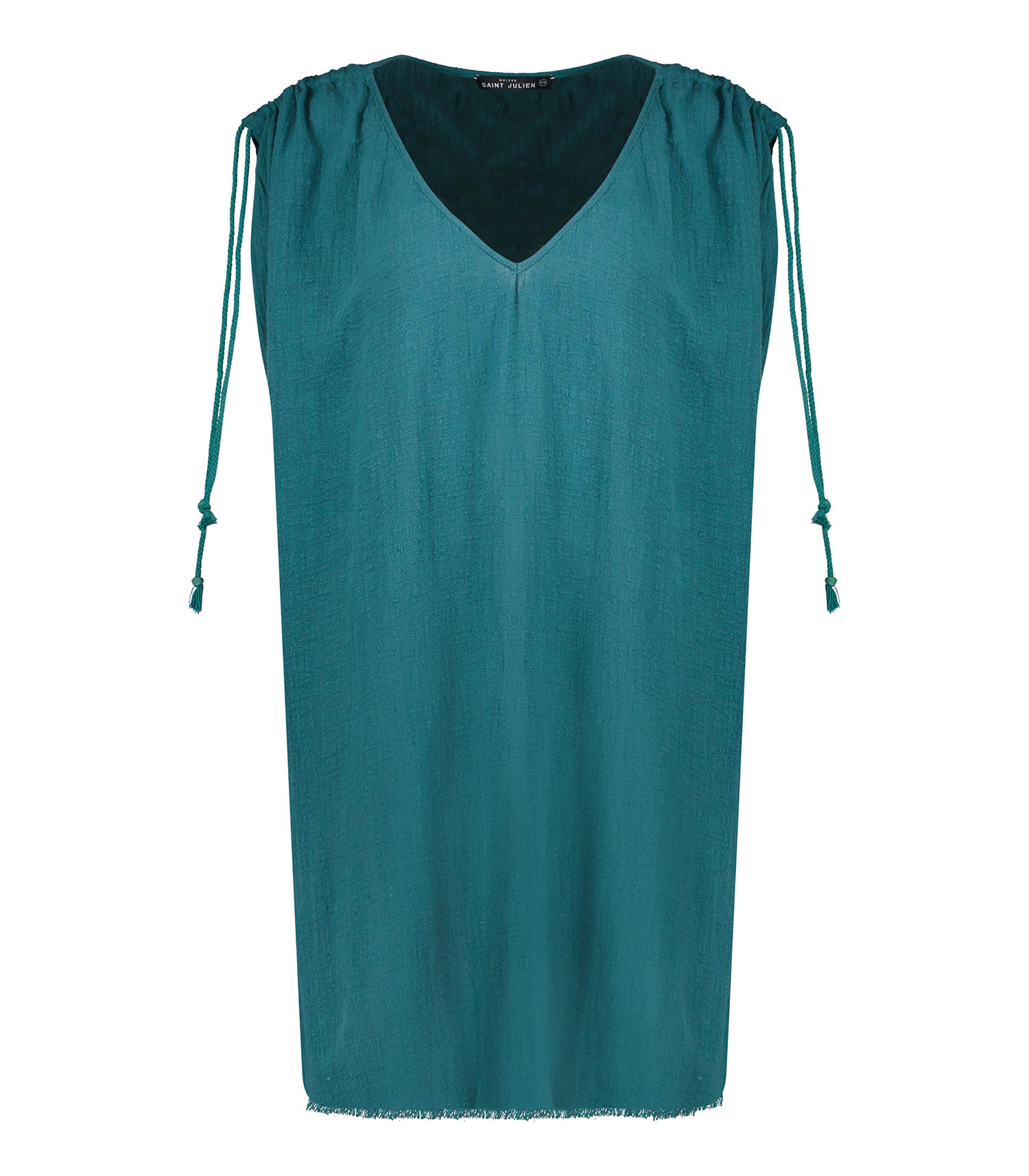Robe courte Alexandrie de la marque Maison Saint Julien, une petite robe kaftan légère et aérienne, parfaite pour l'été, conçue en mousseline de coton et qui offre une allure bohème. Coloris Émeraude édité en exclusivité pour Jane de Boy, facile à porter en toute circonstance.